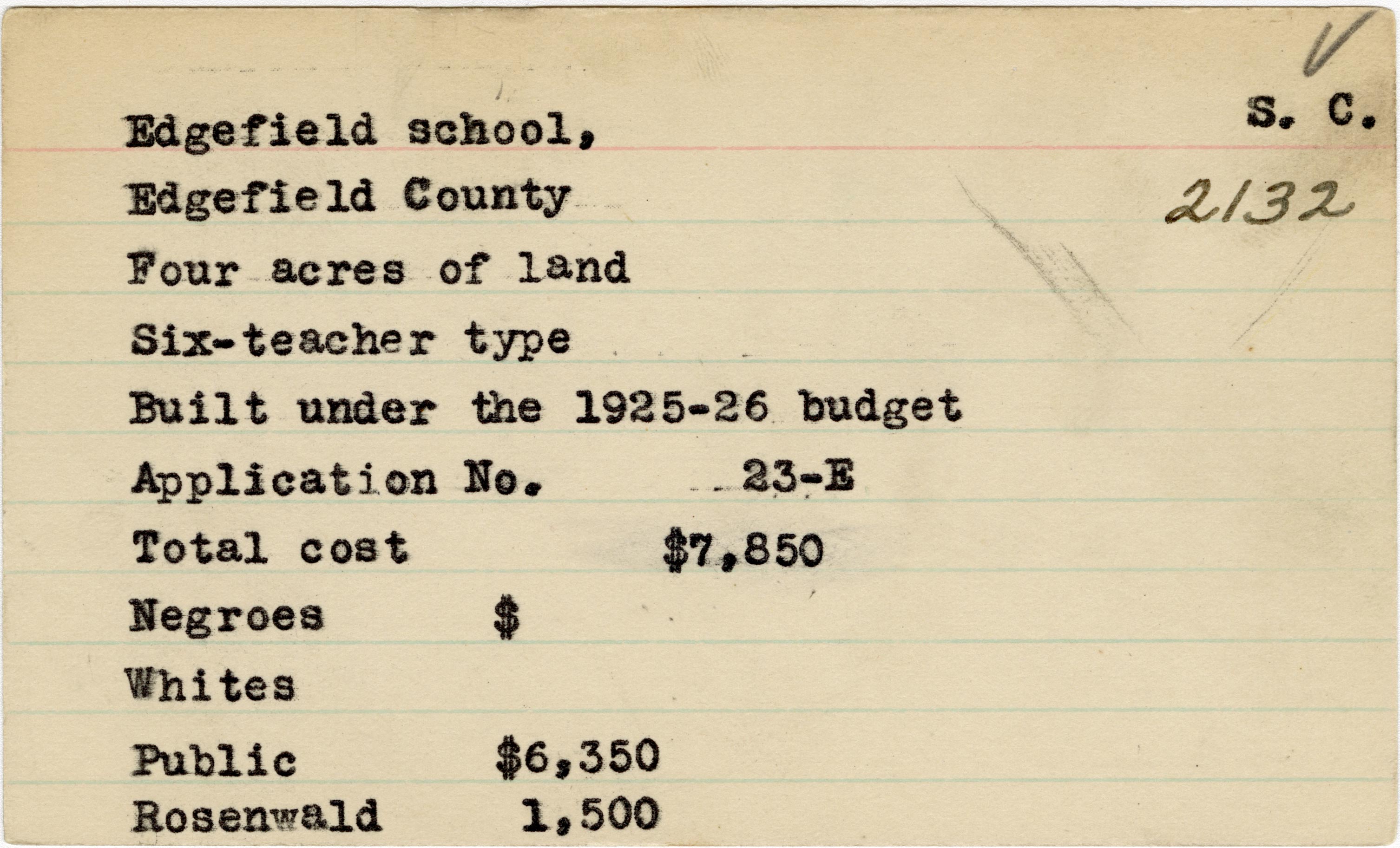 School card from Rosenwald Fund for Edgefield School in Edgefield County, South Carolina