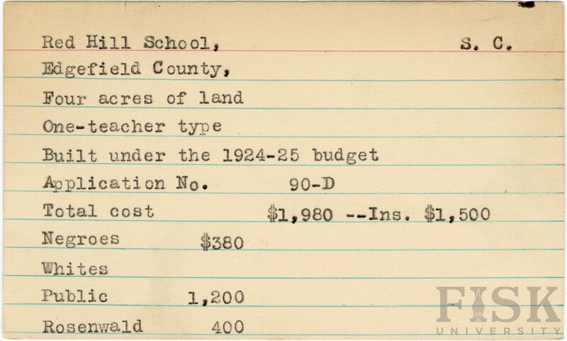 - School card from Rosenwald Fund for Red Hill School in Edgefield County, South Carolina with a section added to the budget contributions that says, "Ins. $1,500"