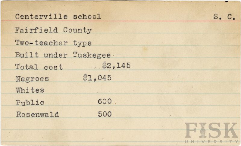 - School card from Rosenwald Fund for Centerville School in Fairfield County, South Carolina