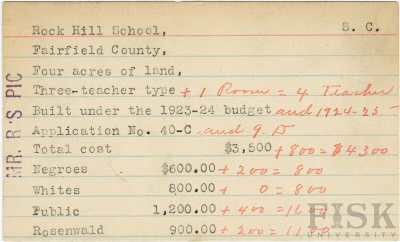 - School card from Rosenwald Fund for Rock Hill School in Fairfield County, South Carolina with handwritten additions to the teacher type, budget year, application number, and budget contribution sections. A note on the far left of the card says, "Mr. R's Pic"