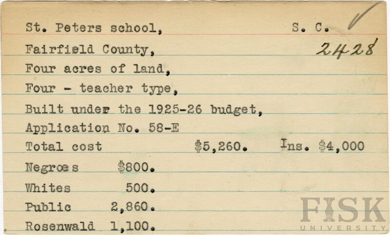 - School card from Rosenwald Fund for St. Peters School in Fairfield County, South Carolina with a section added to the budget contributions that says, "Ins. $4,000"