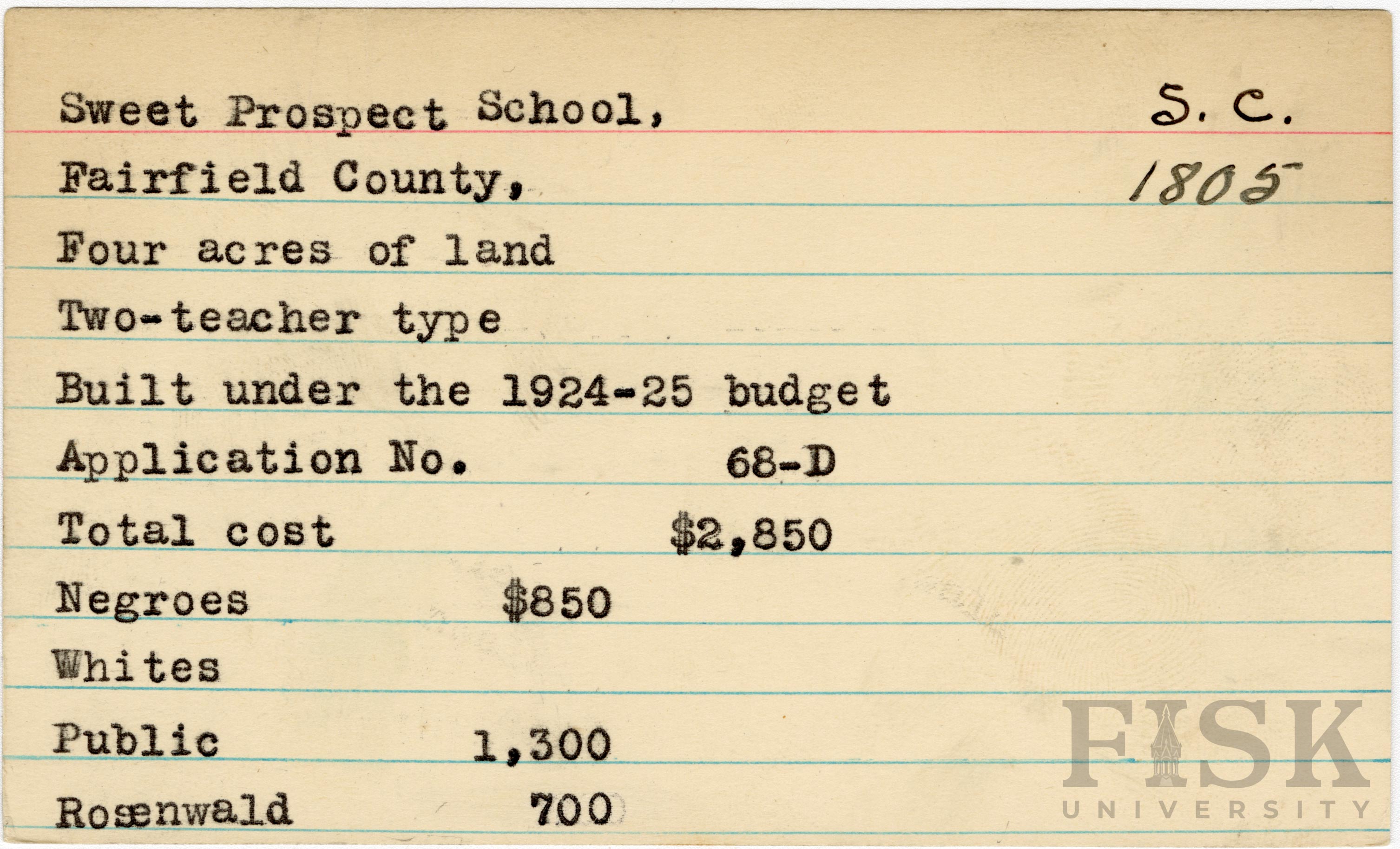- School card from Rosenwald Fund for Sweet Prospect School in Fairfield County, South Carolina