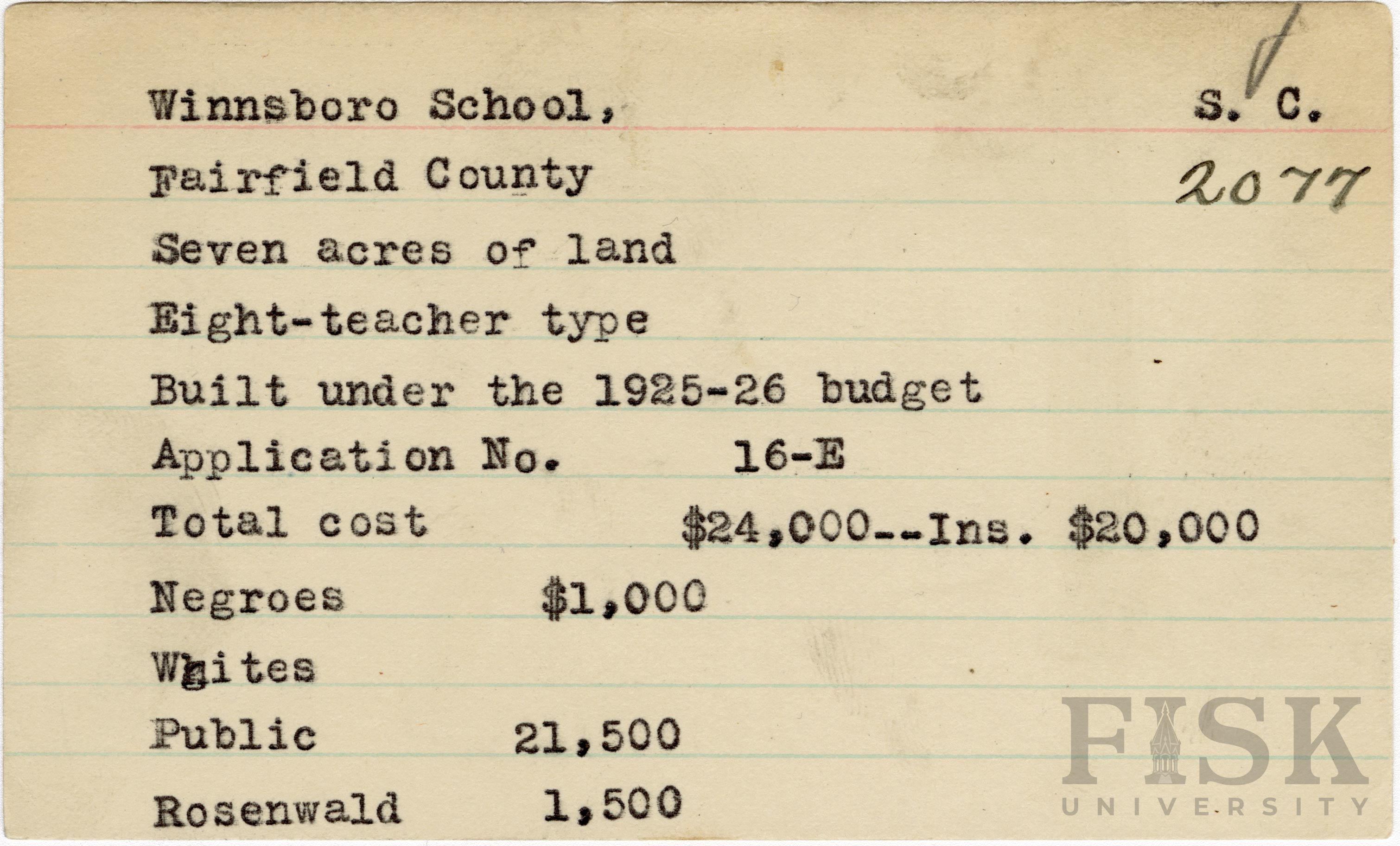 - School card from Rosenwald Fund for Winnsboro School in Fairfield County, South Carolina with a section added to the budget contributions that says, "Ins. $20,000"