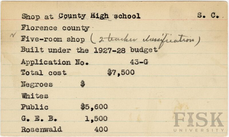 - School card from Rosenwald Fund for the five room shop at County High School in Florence County, South Carolina with a section added to the budget contributions that says, "G.E.B. $1,500"