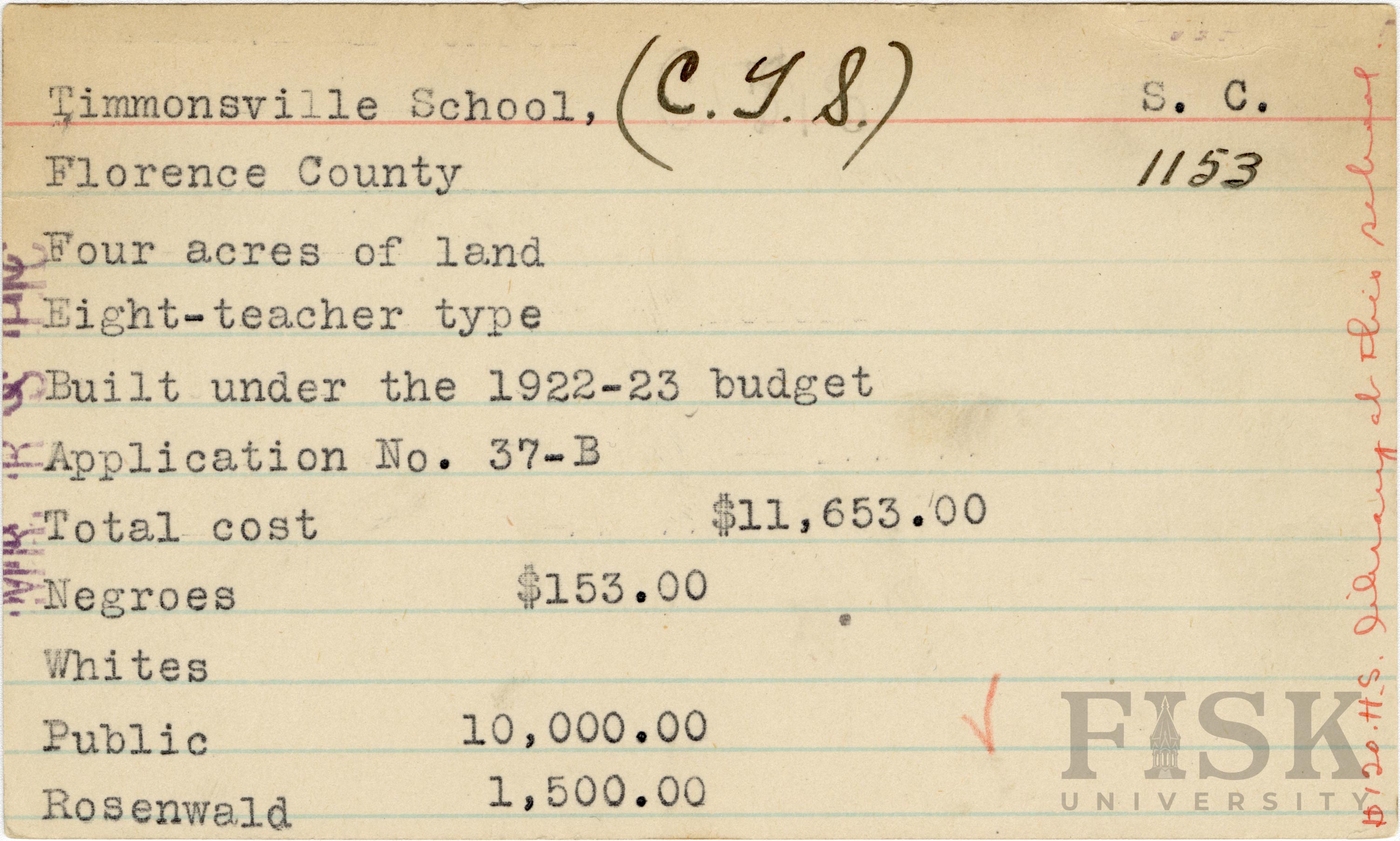 School card from Rosenwald Fund for Timmonsville School in Florence County, South Carolina with notes on the card that say, "Mr. R's Pic" and "$120 H.S. library at this school"