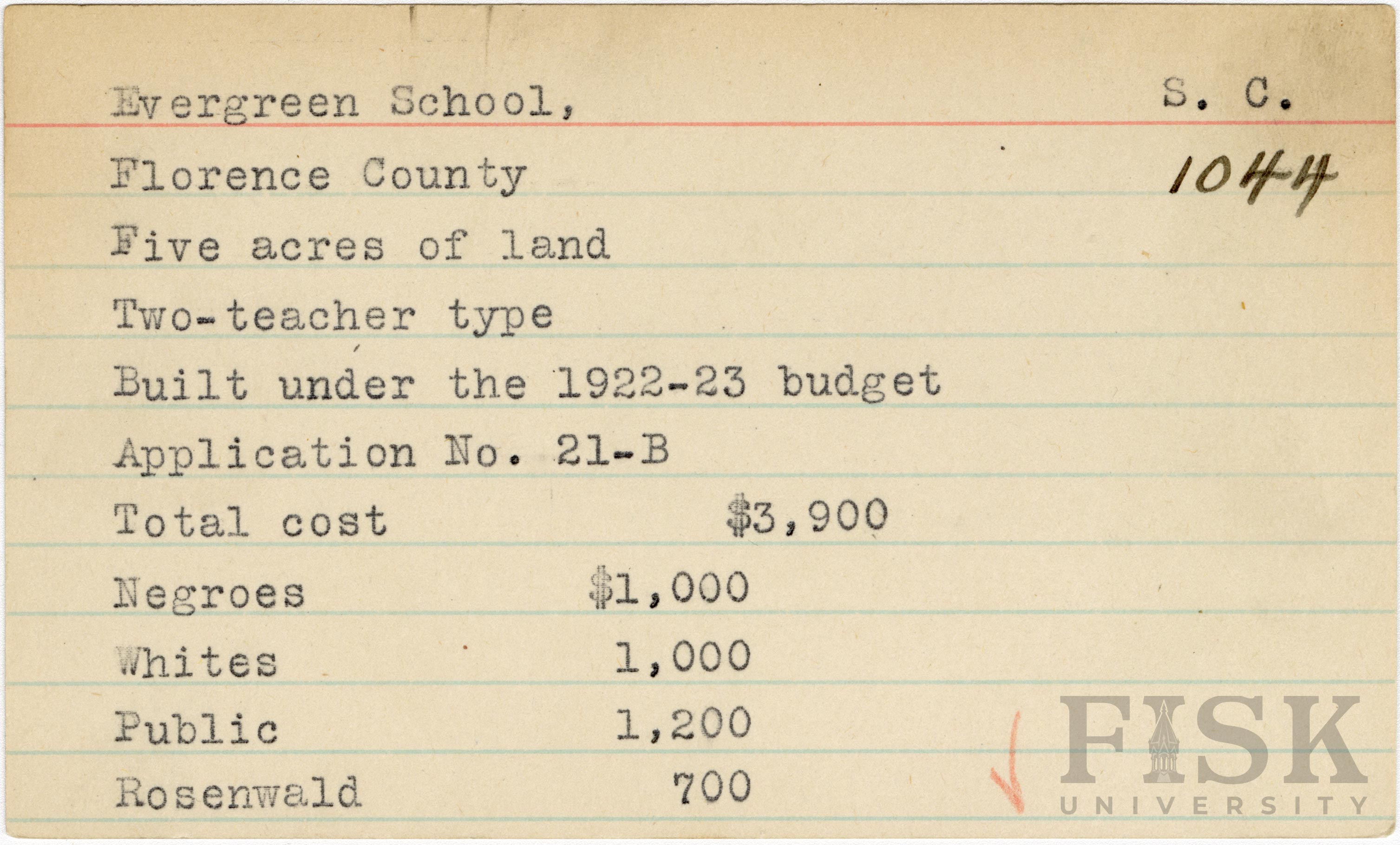 - School card from Rosenwald Fund for Evergreen School in Florence County, South Carolina