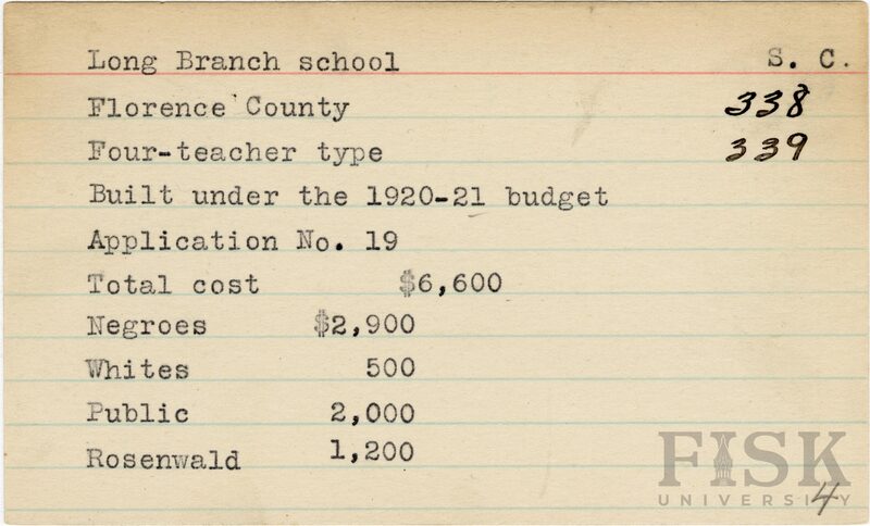 - School card from Rosenwald Fund for Long Branch School in Florence County, South Carolina