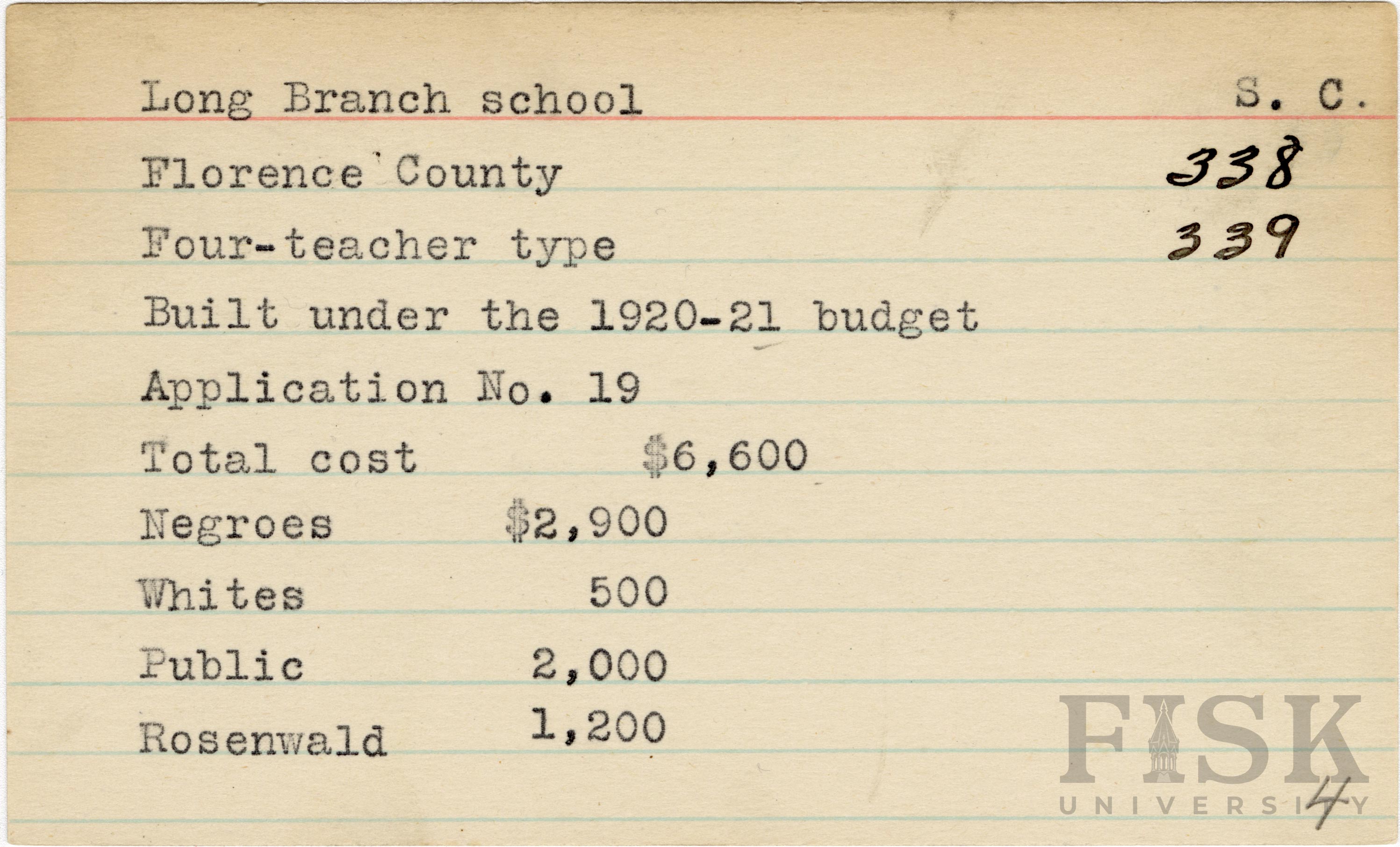 School card from Rosenwald Fund for Long Branch School in Florence County, South Carolina