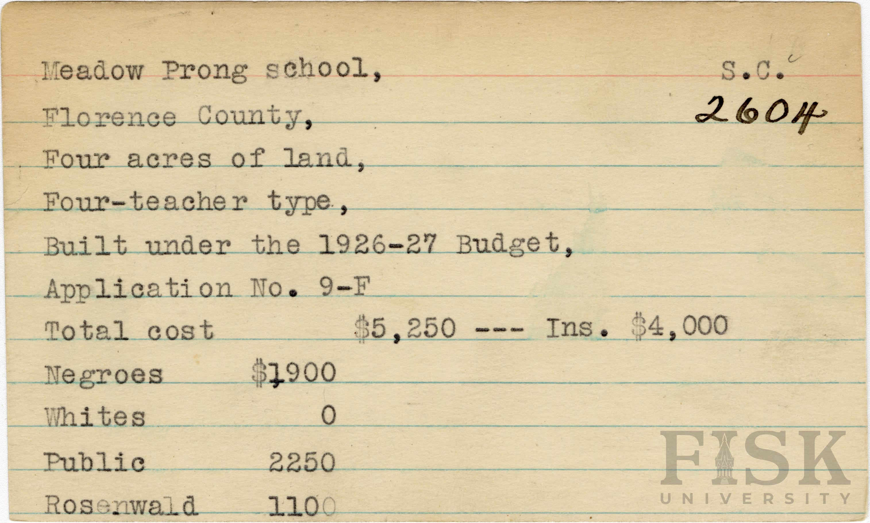 - School card from Rosenwald Fund for Meadow Prong School in Florence County, South Carolina with a section added to the budget contributions that says, "Ins. $4,000"