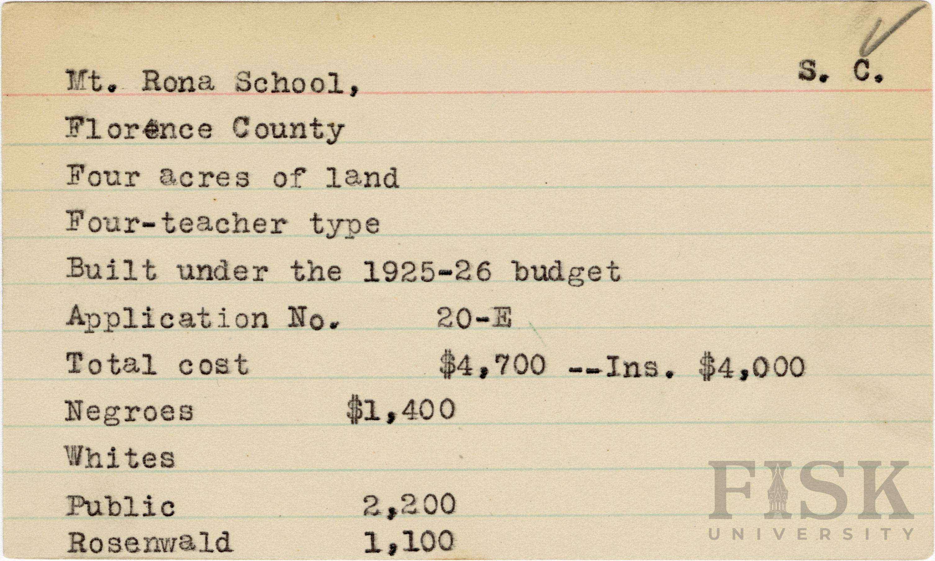 - School card from Rosenwald Fund for Mt. Rona School in Florence County, South Carolina with a section added to the budget contributions that says, "Ins. $4,000"