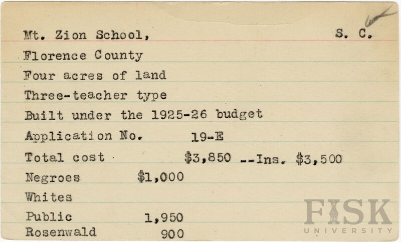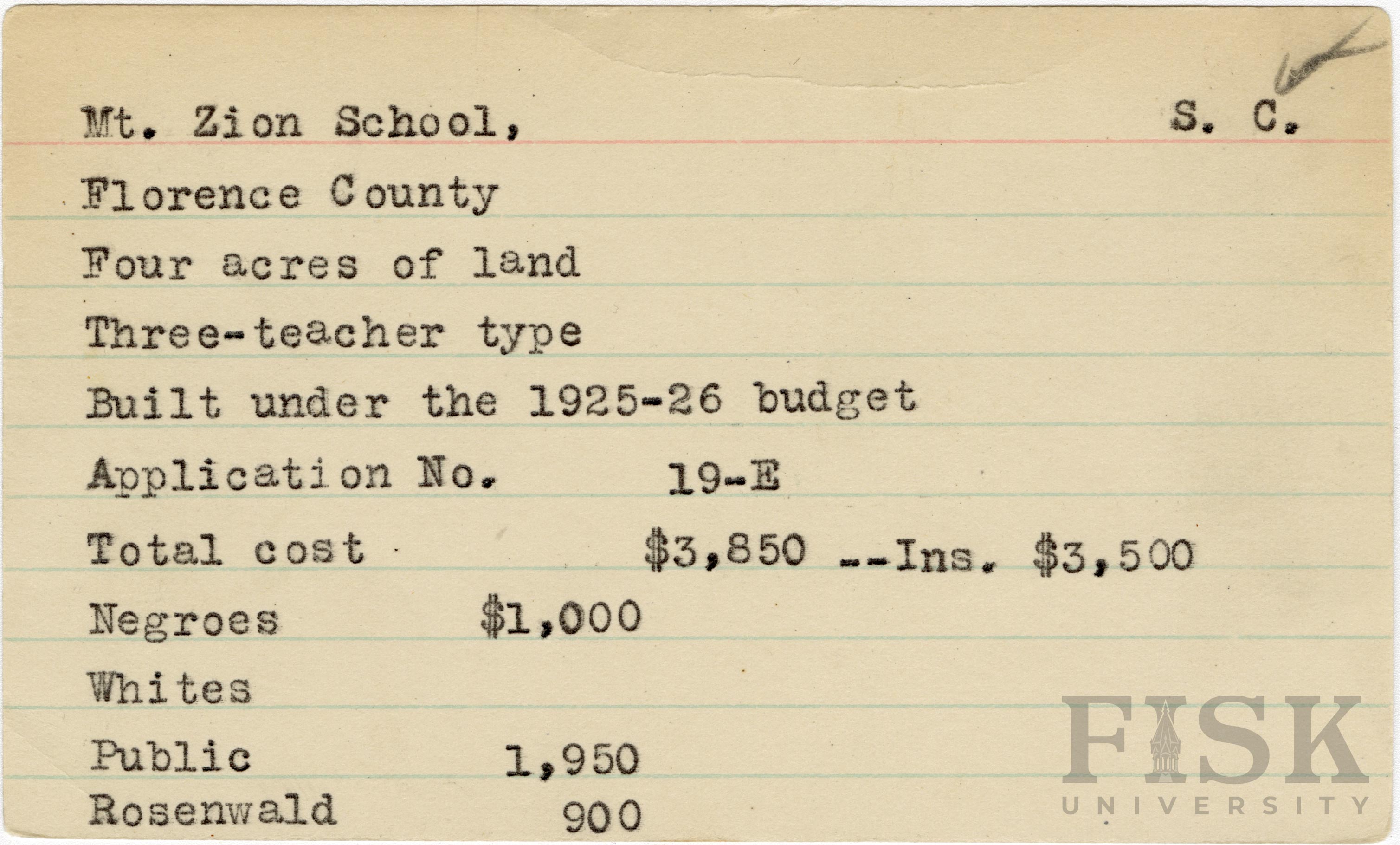 - School card from Rosenwald Fund for Mt. Zion School in Florence County, South Carolina with a section added to the budget contributions that says, "Ins. $3,500"