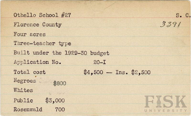 - School card from Rosenwald Fund for Othello School No. 27 in Florence County, South Carolina with a section added to the budget contributions that says, "Ins. $2,500"