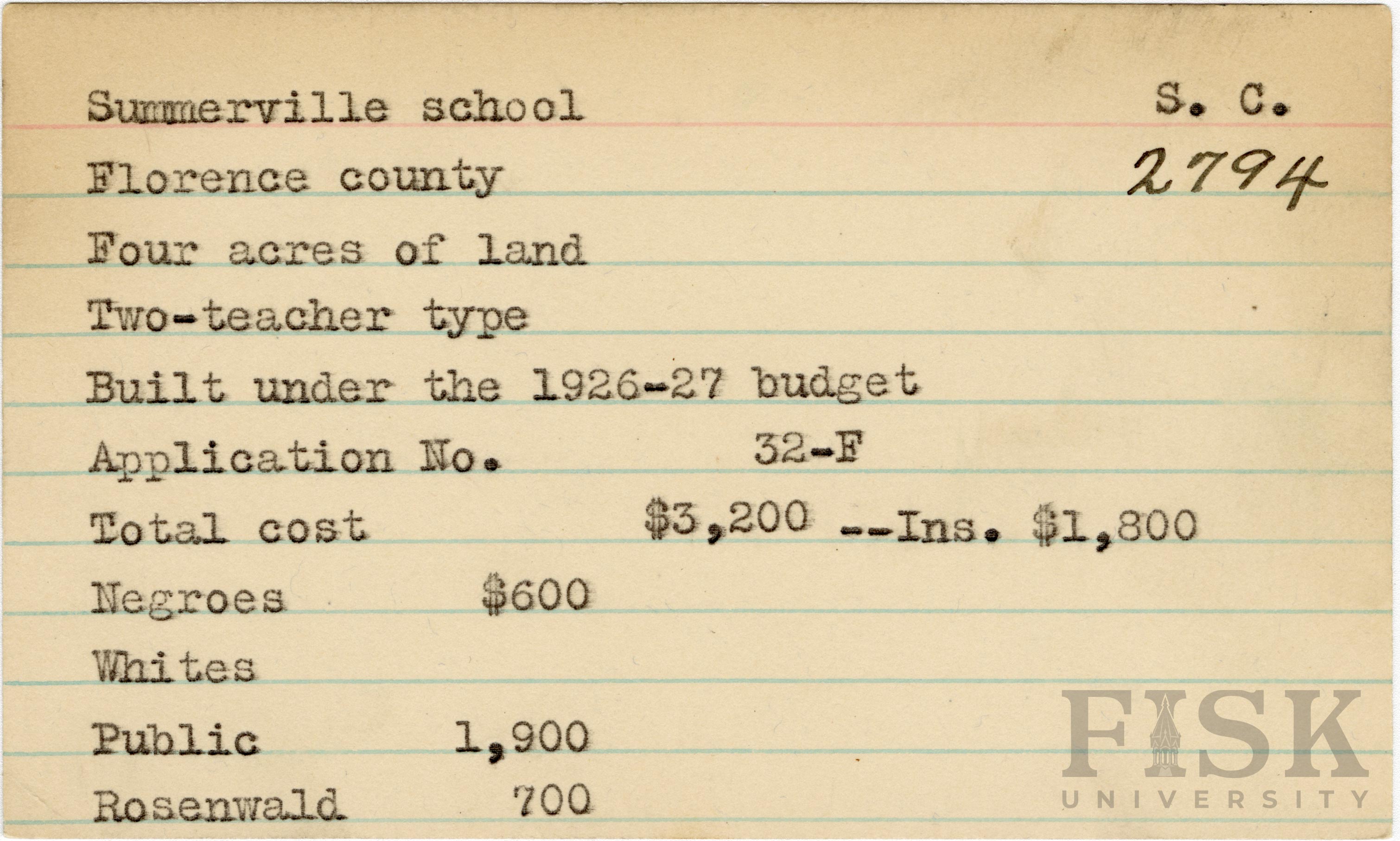 - School card from Rosenwald Fund for Summerville School in Florence County, South Carolina with a section added to the budget contributions that says, "Ins. $1,800"