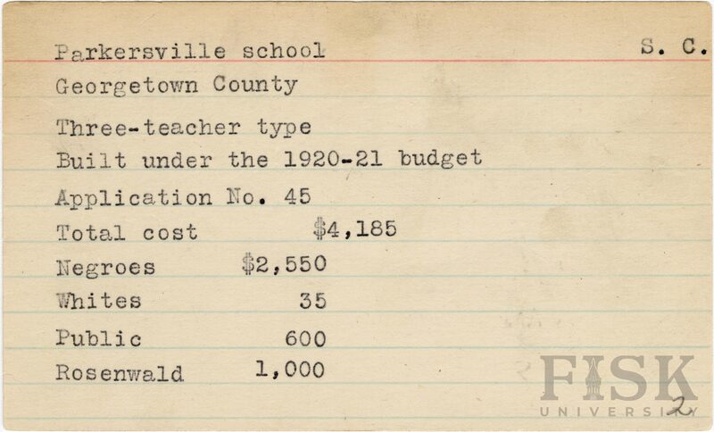 - School card from Rosenwald Fund for Parkersville School in Georgetown County, South Carolina