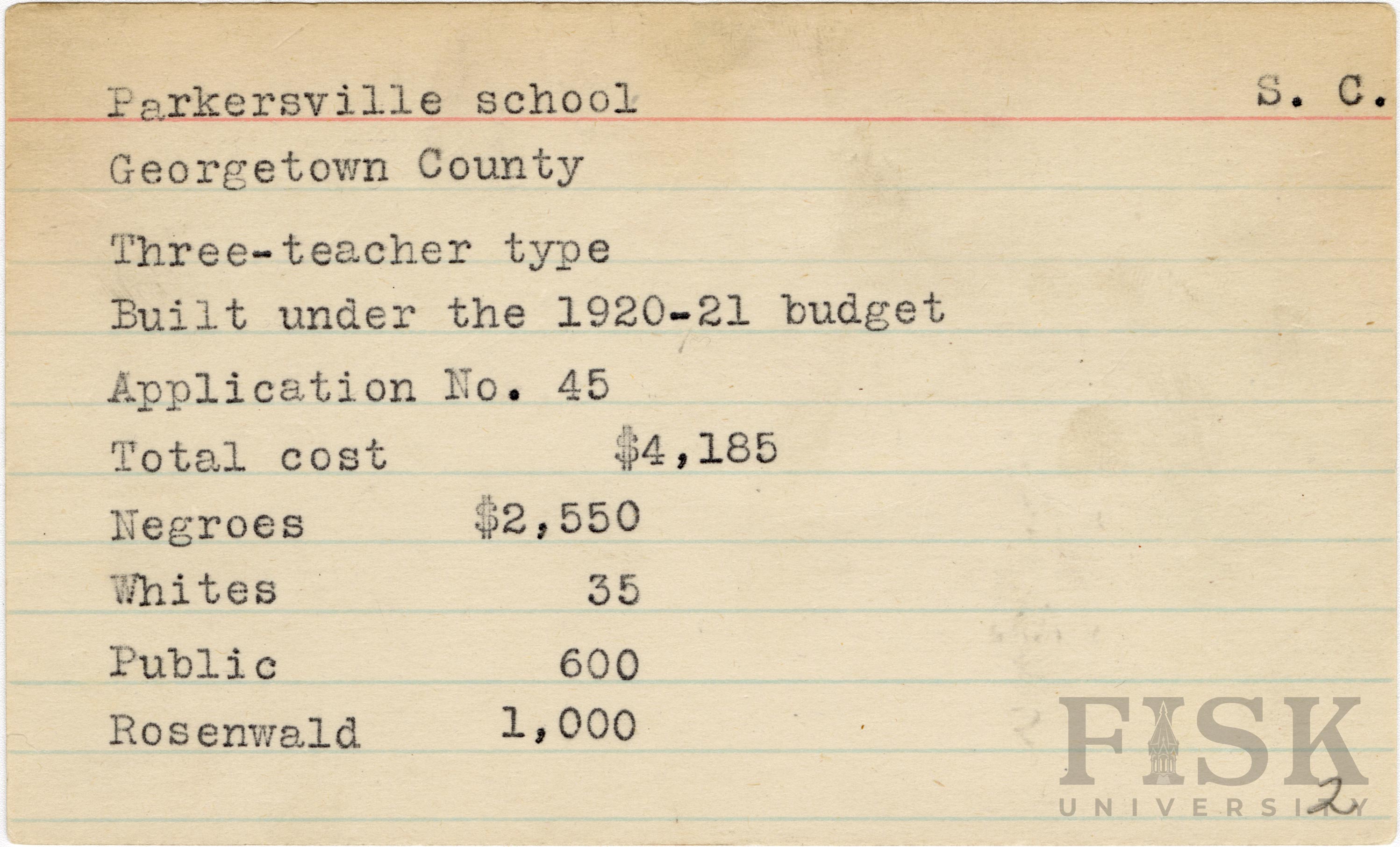 School card from Rosenwald Fund for Parkersville School in Georgetown County, South Carolina