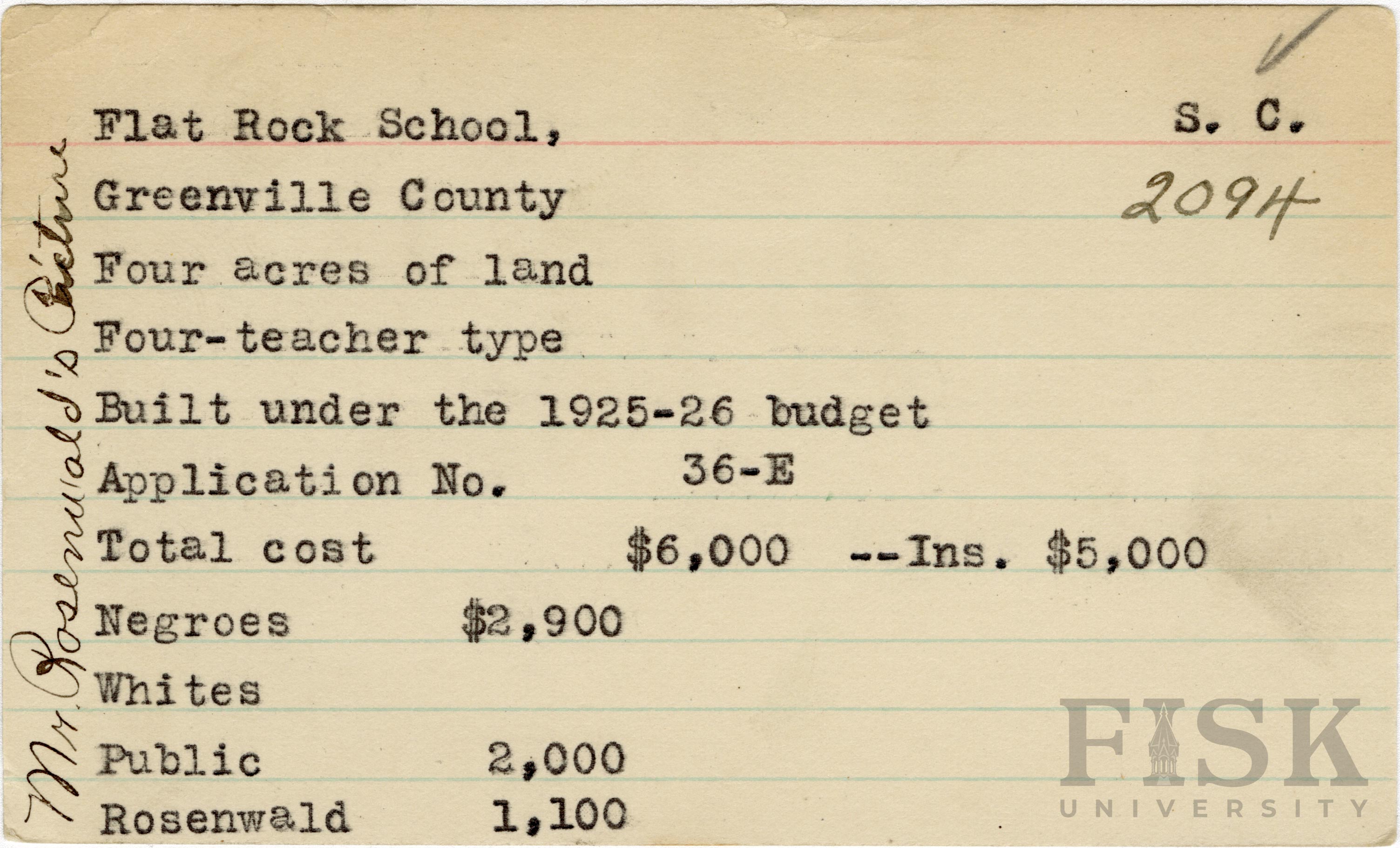 - School card from Rosenwald Fund for Flat Rock School in Greenville County, South Carolina with a section added to the budget contributions that says, "Ins. $5,000" and a handwritten note on the far left of the card that says, "Mr. Rosenwald's Picture"