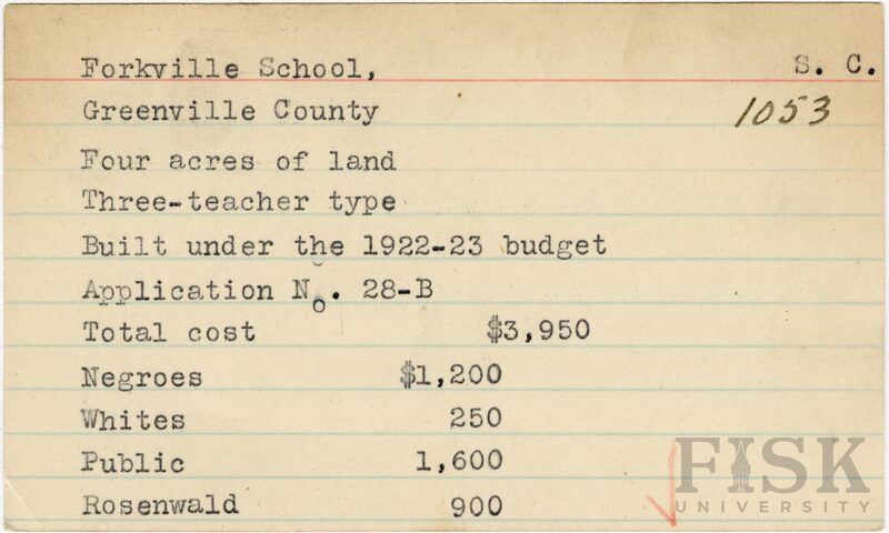 School card from Rosenwald Fund for Forkville School in Greenville County, South Carolina