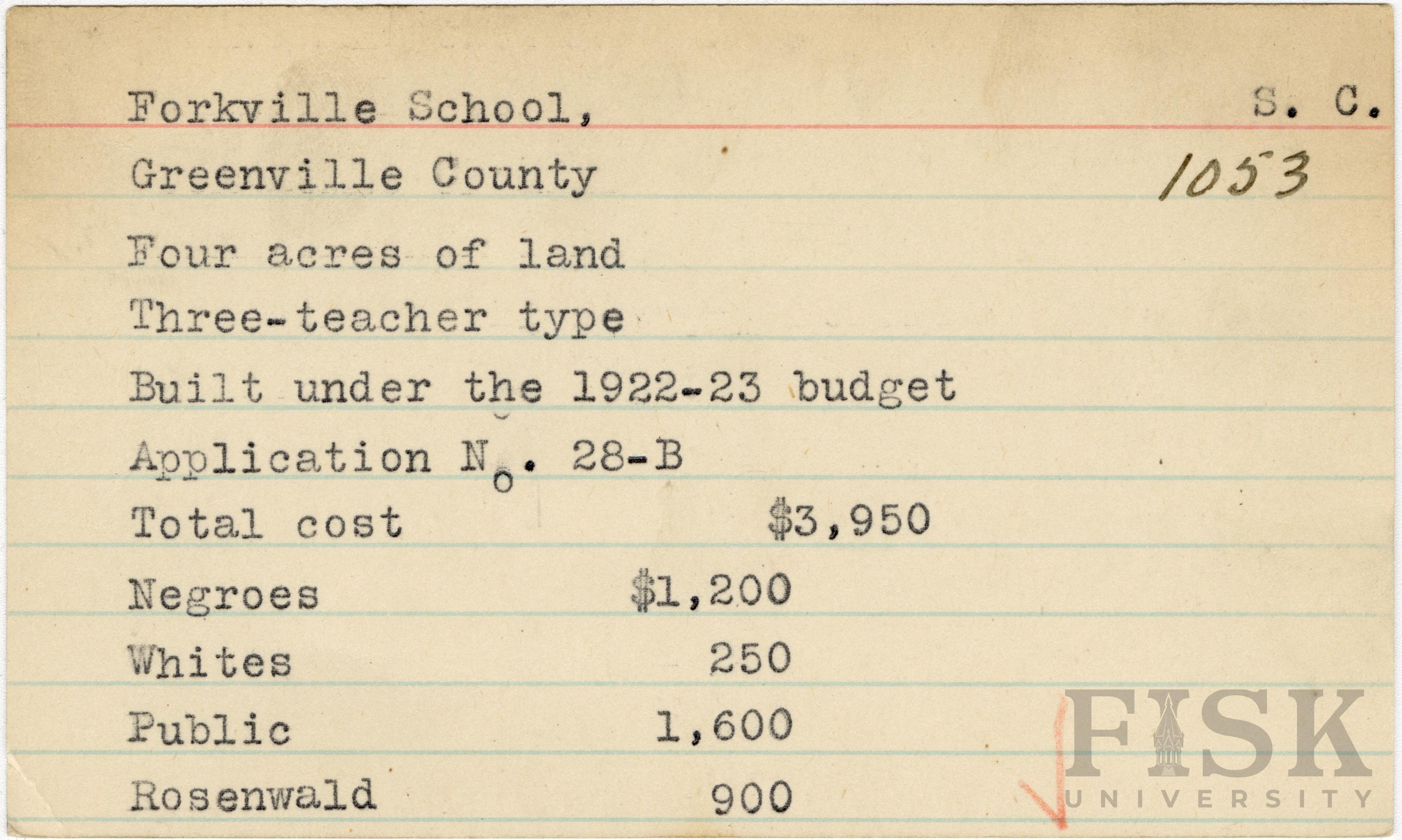 - School card from Rosenwald Fund for Forkville School in Greenville County, South Carolina
