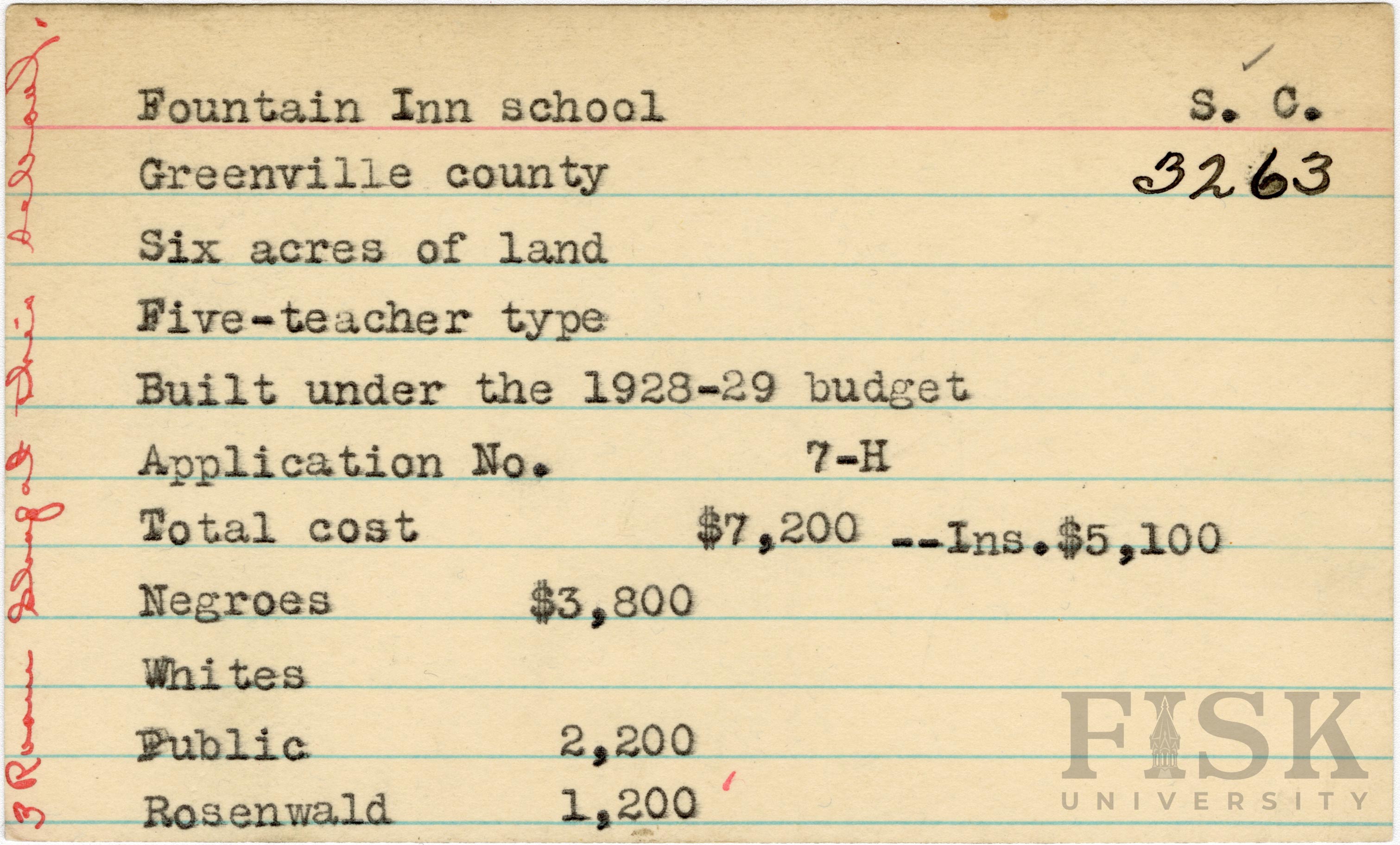 - School card from Rosenwald Fund for Fountain Inn School in Greenville County, South Carolina with a section added to the budget contributions that says, "Ins. $5,100" and a handwritten note on the far left of the card that says, "3 room shop at this school"