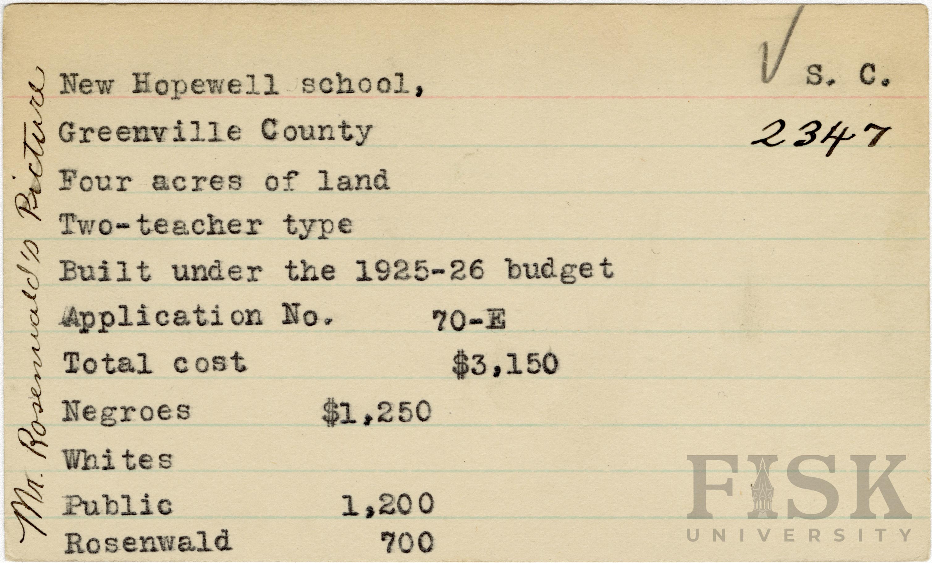 - School card from Rosenwald Fund for New Hopewell School in Greenville County, South Carolina with a handwritten note on the far left of the card that says, "Mr. Rosenwald's Picture"