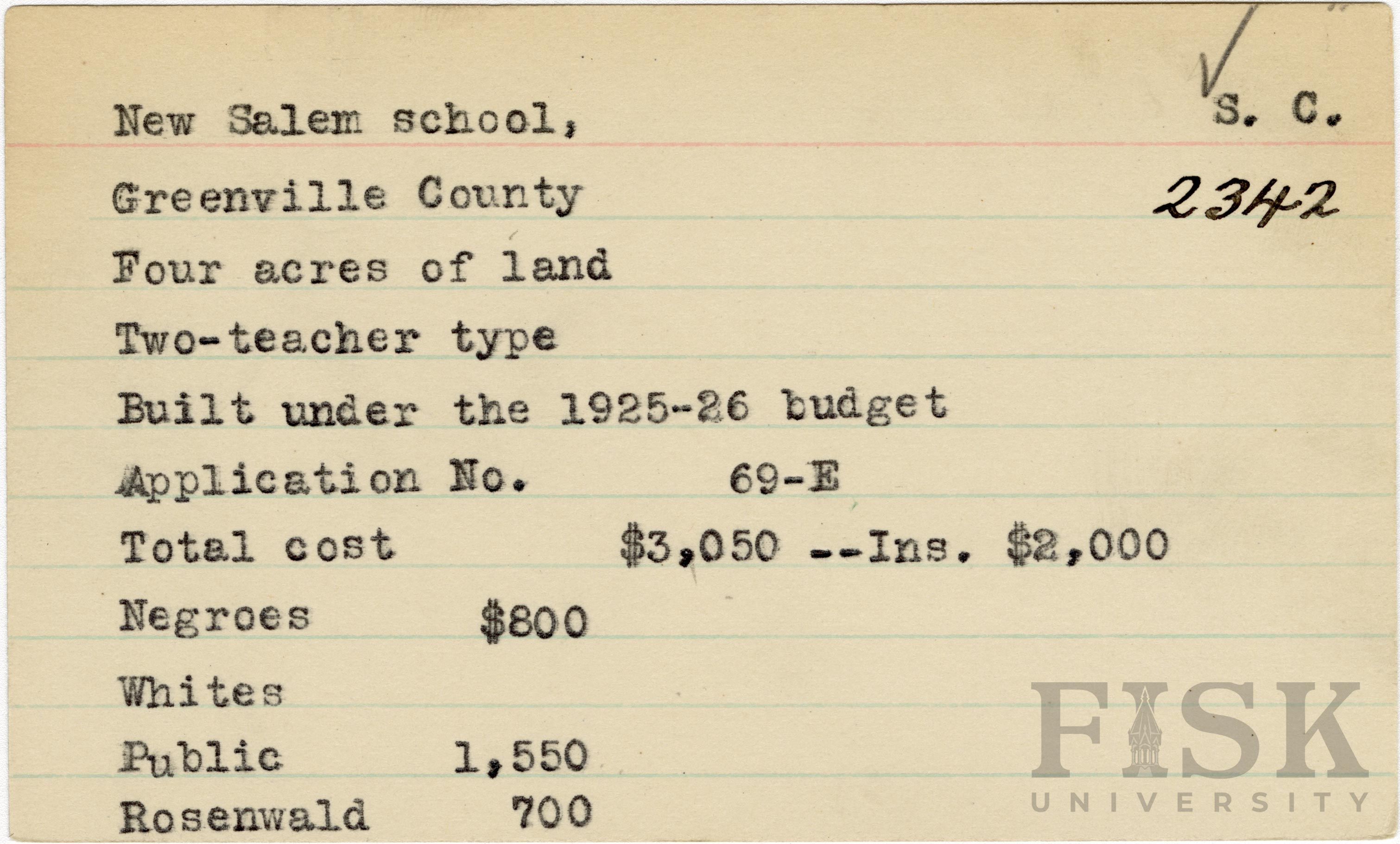 - School card from Rosenwald Fund for New Salem School in Greenville County, South Carolina with a section added to the budget contributions that says, "Ins. $2,000"