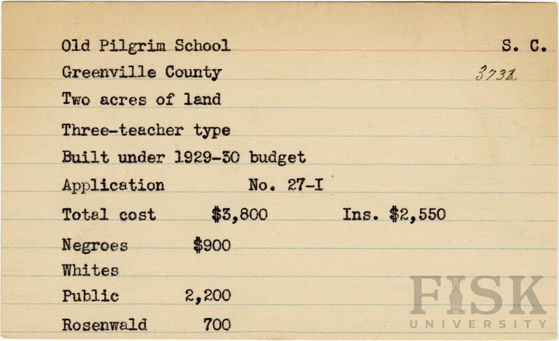 - School card from Rosenwald Fund for Old Pilgrim School in Greenville County, South Carolina with a section added to the budget contributions that says, "Ins. $2,550"