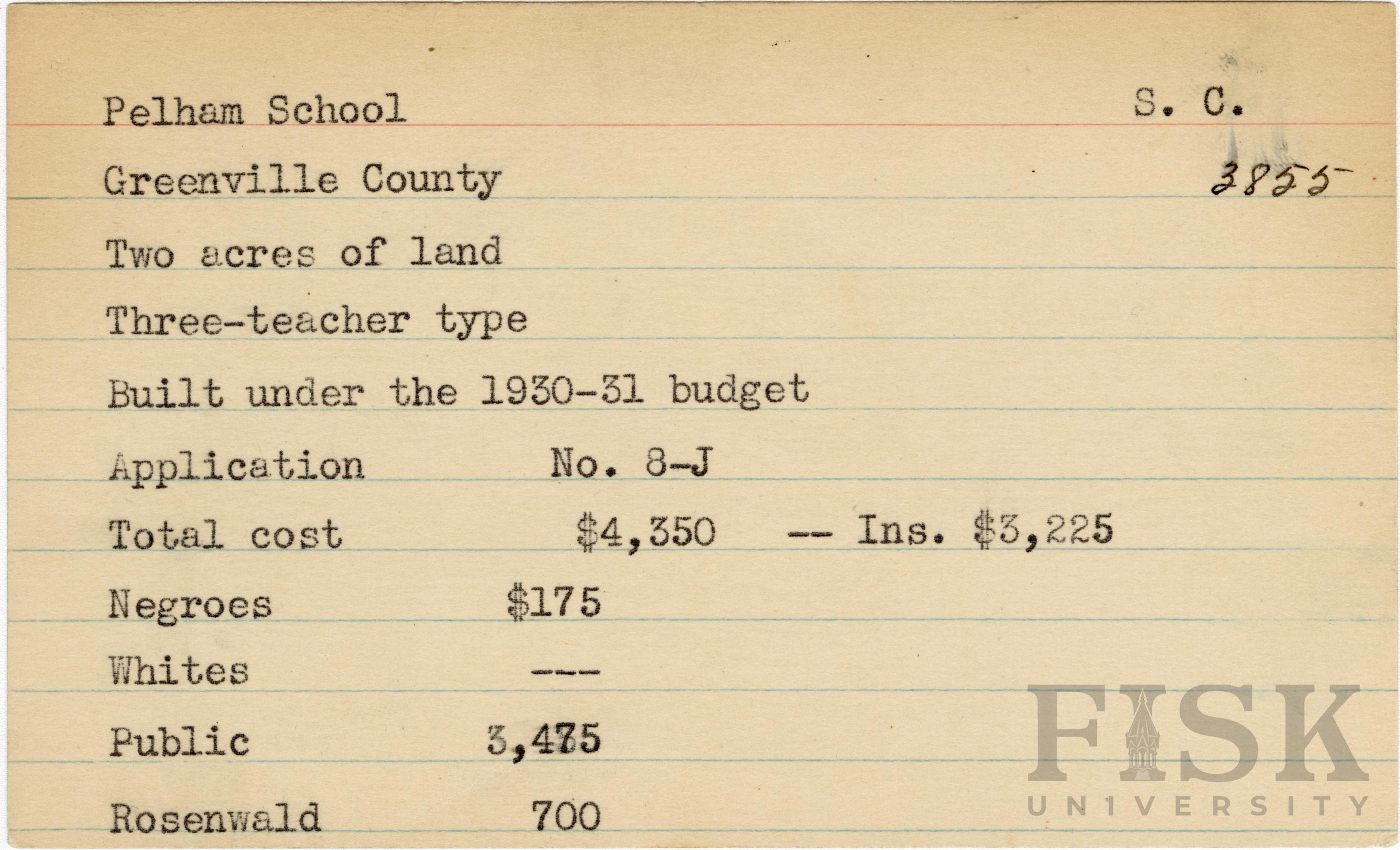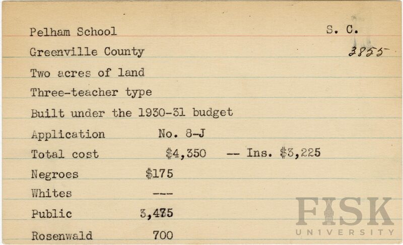 - School card from Rosenwald Fund for Pelham School in Greenville County, South Carolina with a section added to the budget contributions that says, "Ins. $3,225"