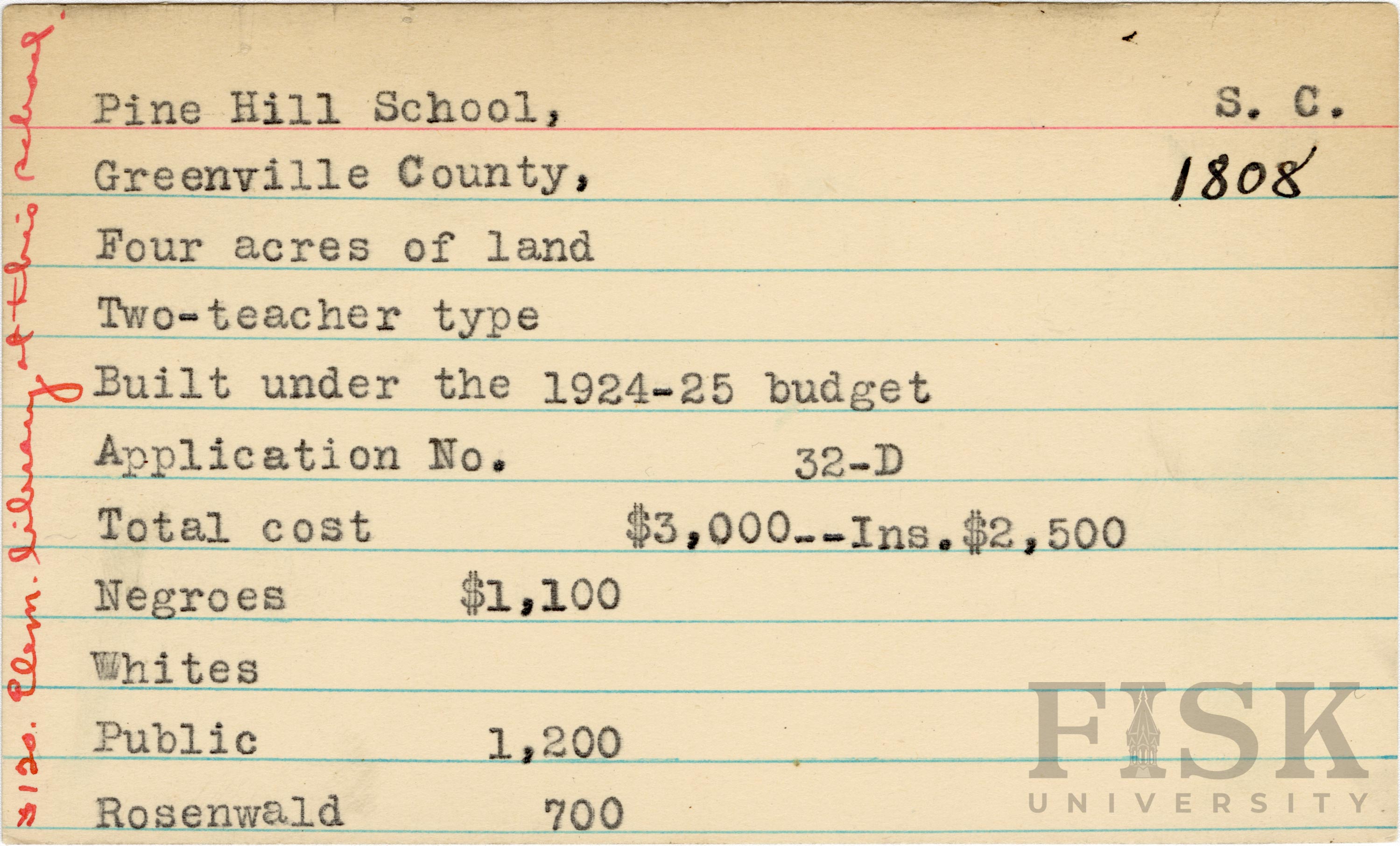 - School card from Rosenwald Fund for Pine Hill School in Greenville County, South Carolina with a section added to the budget contributions that says, "Ins. $2,500" and a handwritten note on the far left of the card that says, "$120 elem. Library at this school"