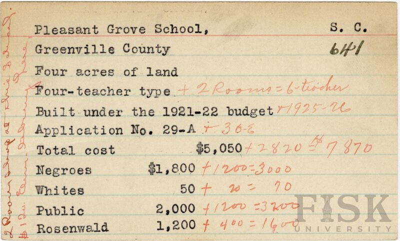 - School card from Rosenwald Fund for Pleasant Grove School in Greenville County, South Carolina with a section added to the budget that says, "Ins. $2,500" and a handwritten note on the far left of the card that says, "2 room shop at this school" and "$120 Elem. Library Here."