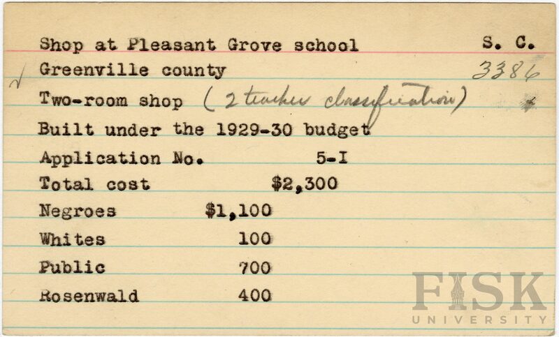 - School card from Rosenwald Fund for the two room shop at Pleasant Grove School in Greenville County, South Carolina