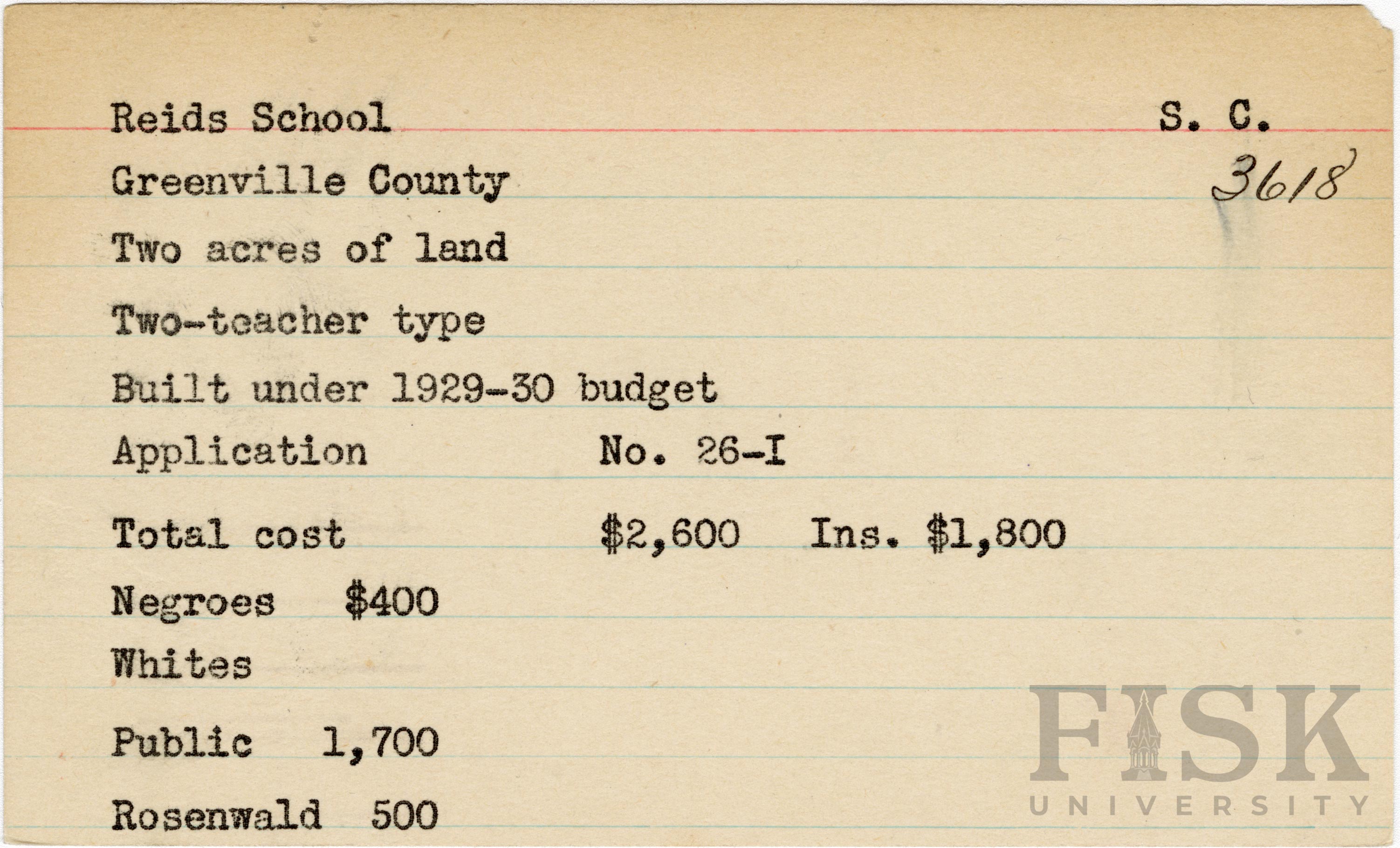 - School card from Rosenwald Fund for Reids School in Greenville County, South Carolina with a section added to the budget contributions that says, "Ins. $1,800"