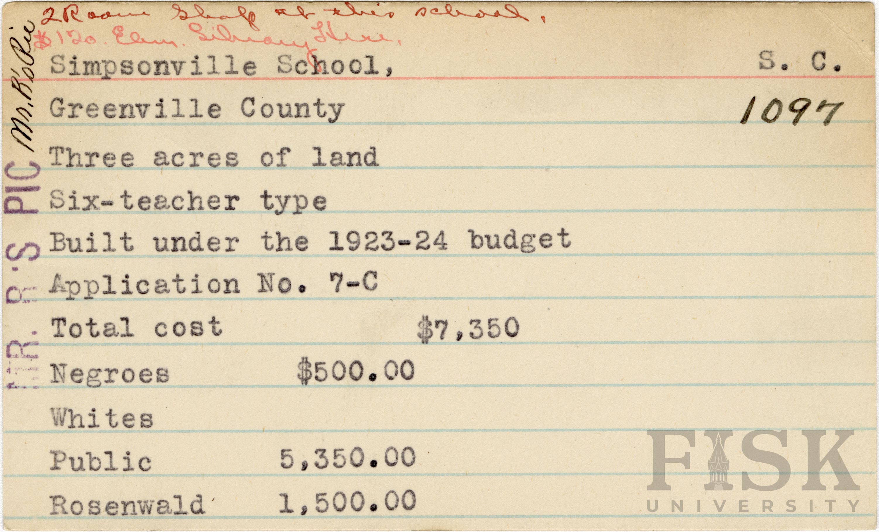 School card from Rosenwald Fund for Simpsonville School in Greenville County, South Carolina with notes on the card that say, "Mr. R's Pic," "Mr. R's Pic," "2 room shop at this school," and "$120 elem library here"