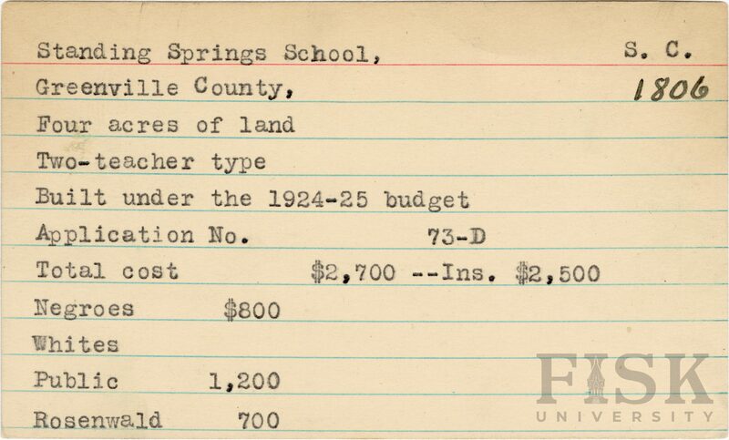 - School card from Rosenwald Fund for Standing Springs School in Greenville County, South Carolina with a section added to the budget contributions that says, "Ins. $2,500"