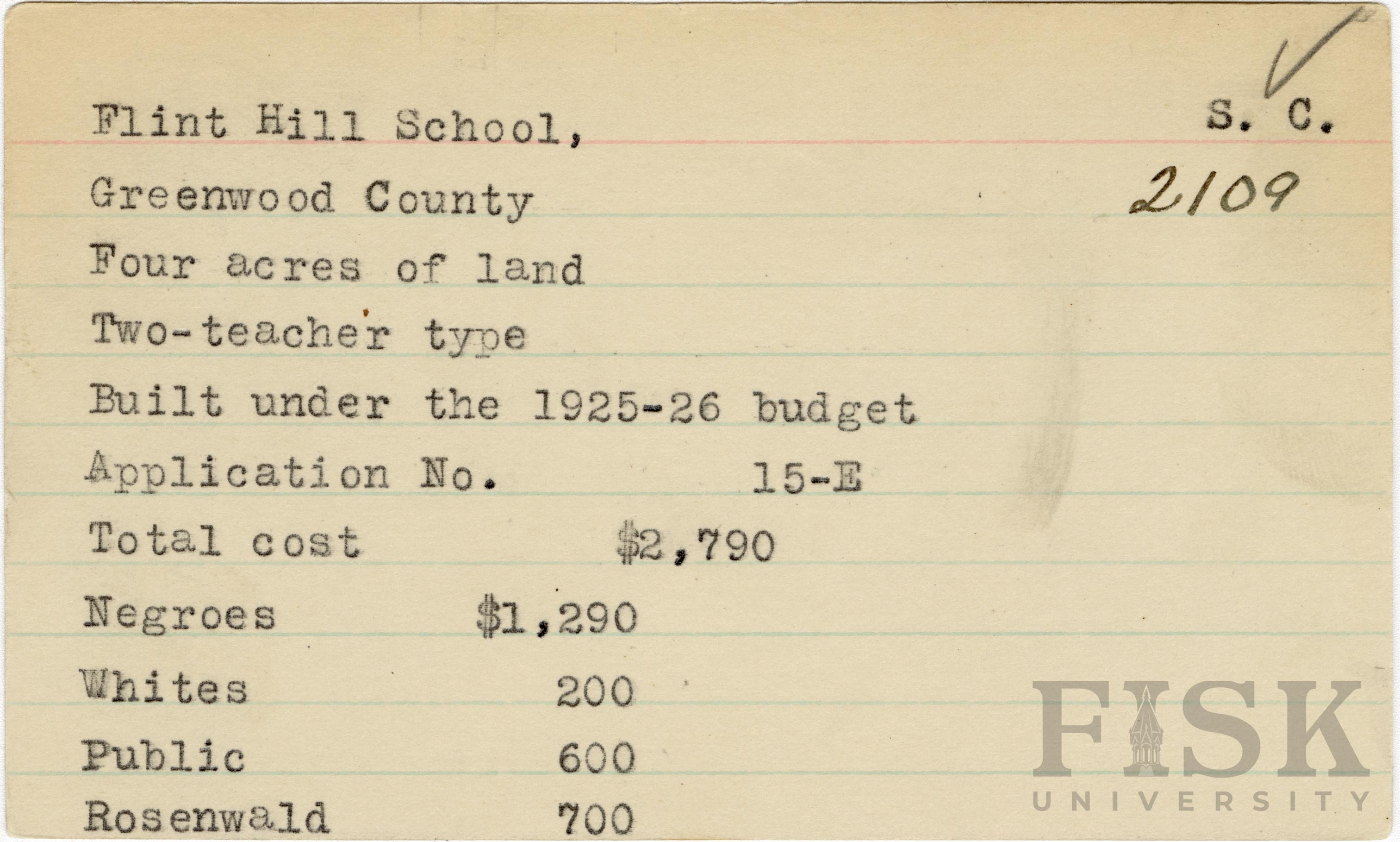 - School card from Rosenwald Fund for Flint Hill School in Greenwood County, South Carolina