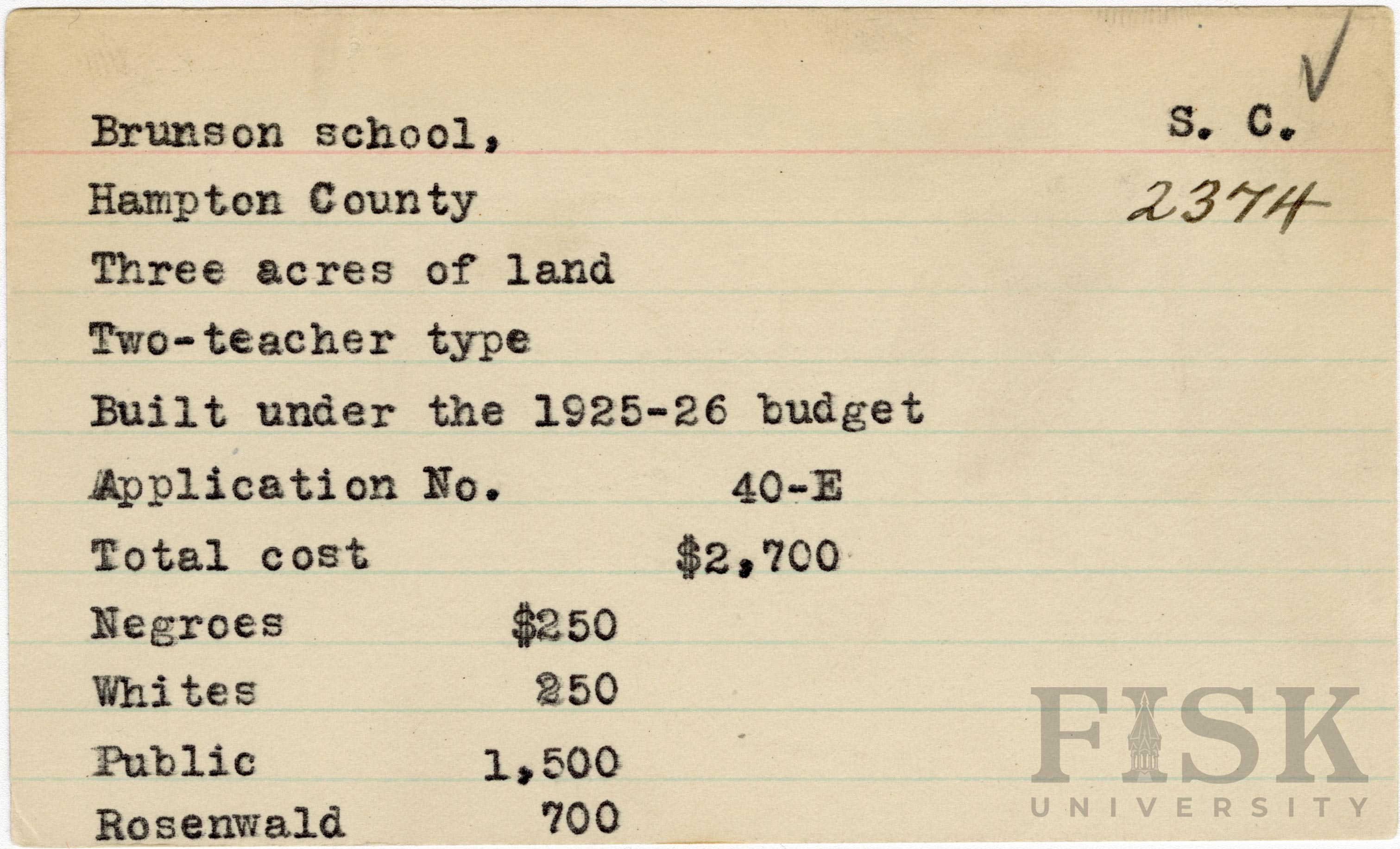 - School card from Rosenwald Fund for Brunson School in Hampton County, South Carolina