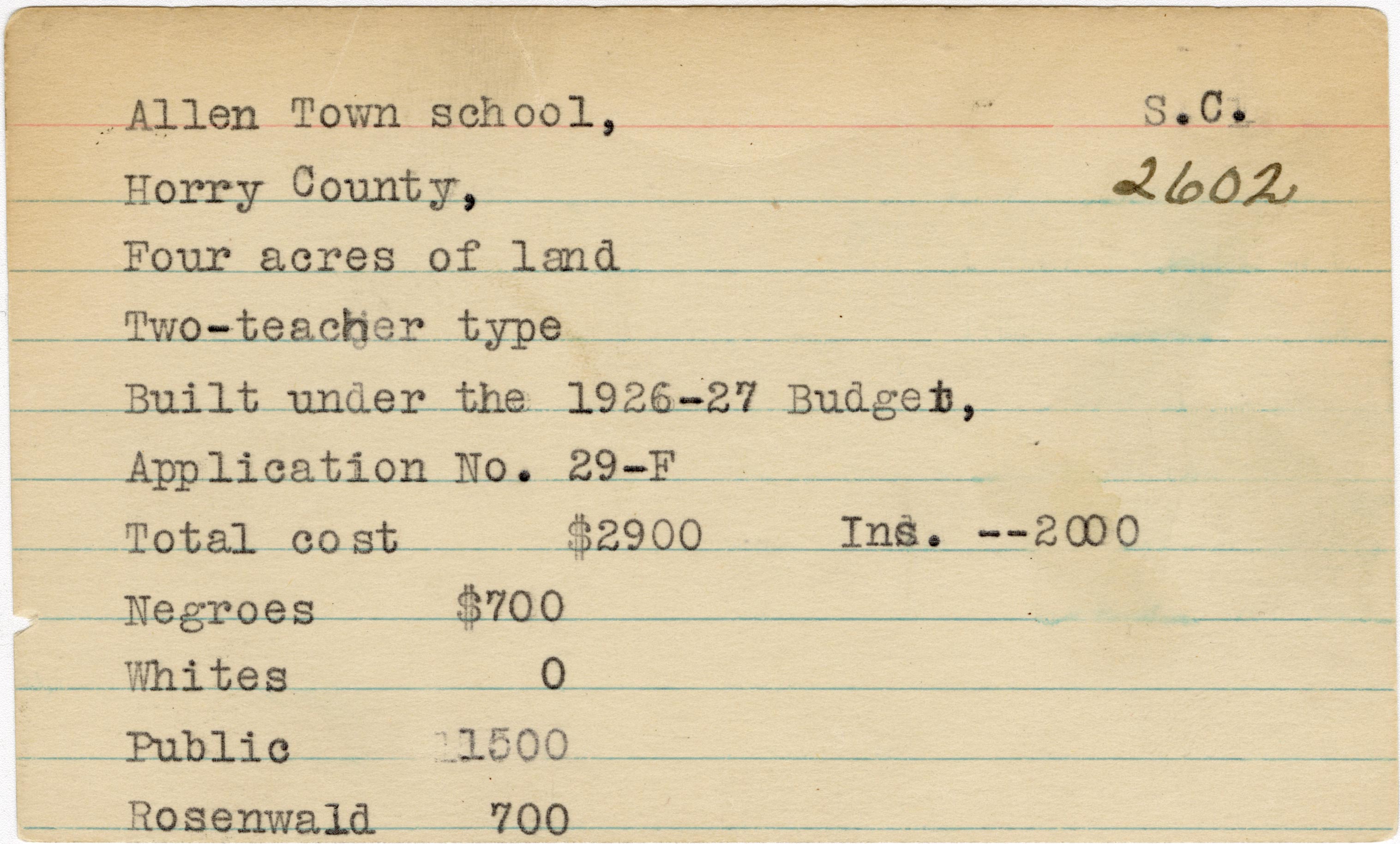 - School card from Rosenwald Fund for Allen Town School in Horry County, South Carolina with a section added to the budget contributions that says, "Ins. --2000"