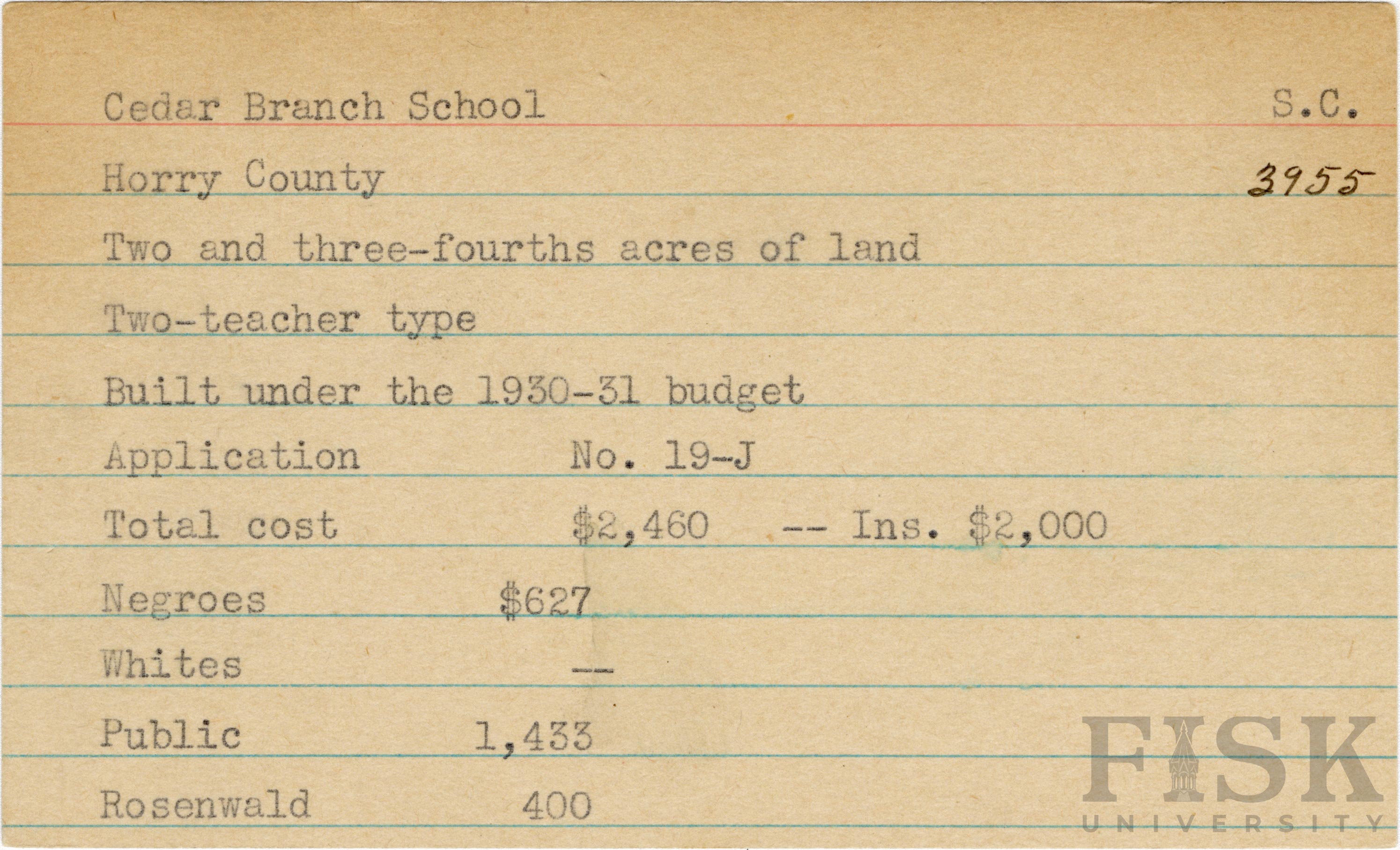 - School card from Rosenwald Fund for Cedar Branch School in Horry County, South Carolina with a section added to the budget contributions that says, "Ins. $2,000"
