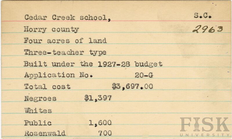 - School card from Rosenwald Fund for Cedar Creek School in Horry County, South Carolina