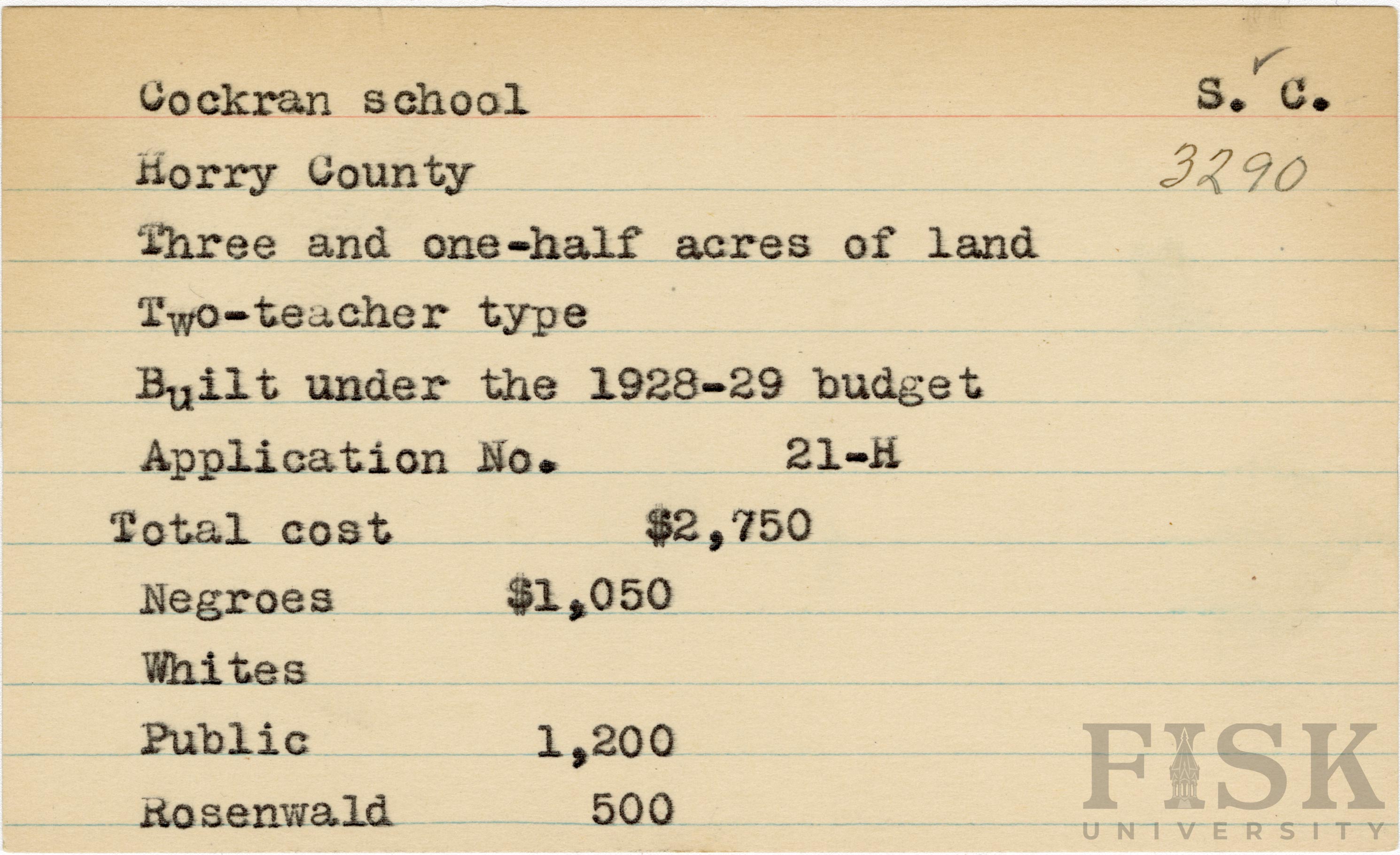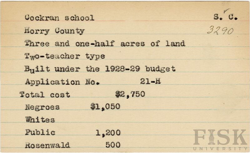 School card from Rosenwald Fund for Cockran School in Horry County, South Carolina
