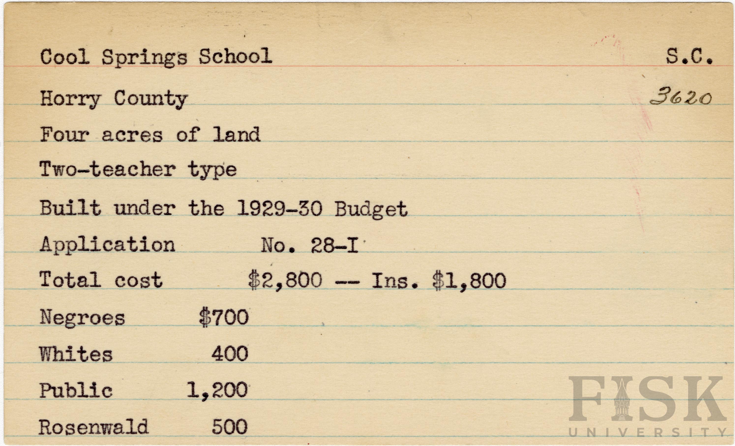 - School card from Rosenwald Fund for Cool Springs School in Horry County, South Carolina with a section added to the budget contributions that says, "Ins. $1,800"