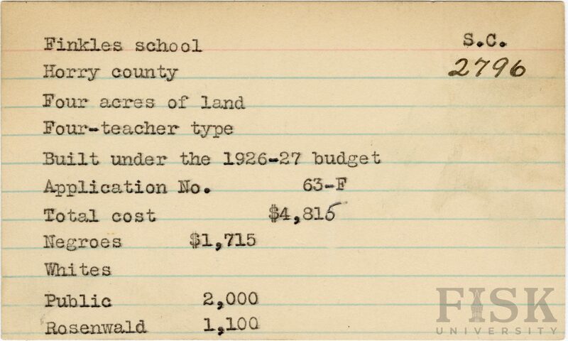 - School card from Rosenwald Fund for Finkles School in Horry County, South Carolina