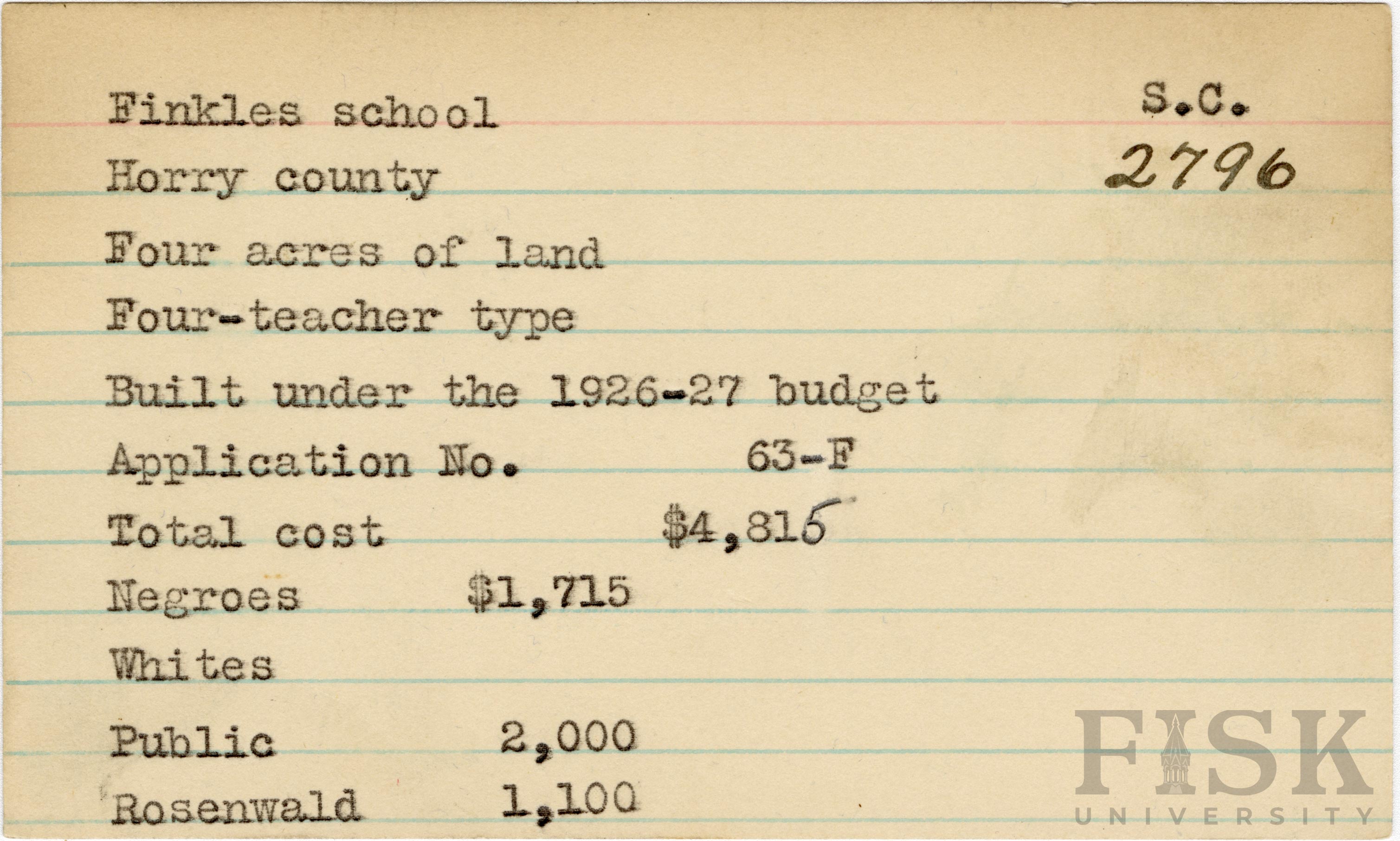 School card from Rosenwald Fund for Finkles School in Horry County, South Carolina