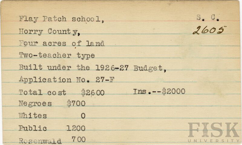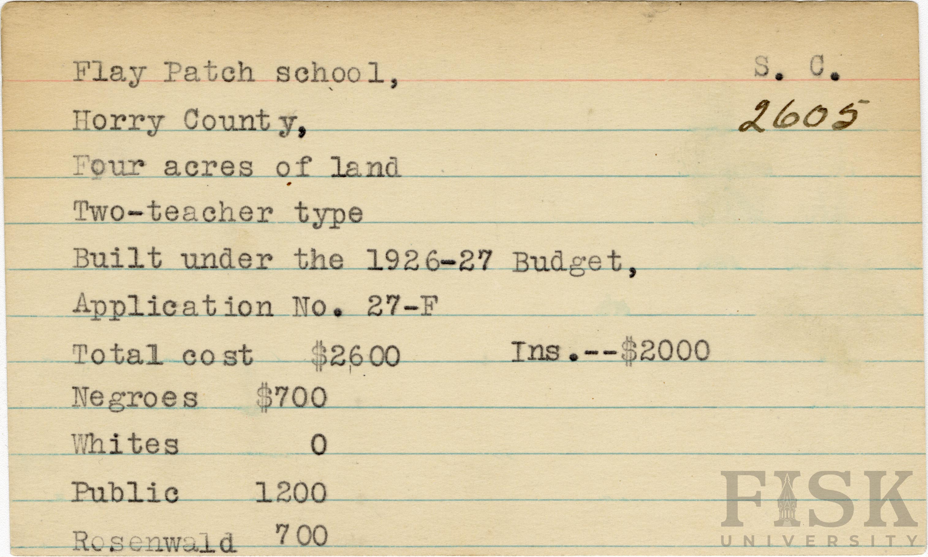 - School card from Rosenwald Fund for Flay Patch School in Horry County, South Carolina with a section added to the budget contributions that says, "Ins. $2,000"