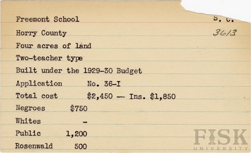 - School card from Rosenwald Fund for Freemont School in Horry County, South Carolina with a section added to the budget contributions that says, "Ins. $1,850"