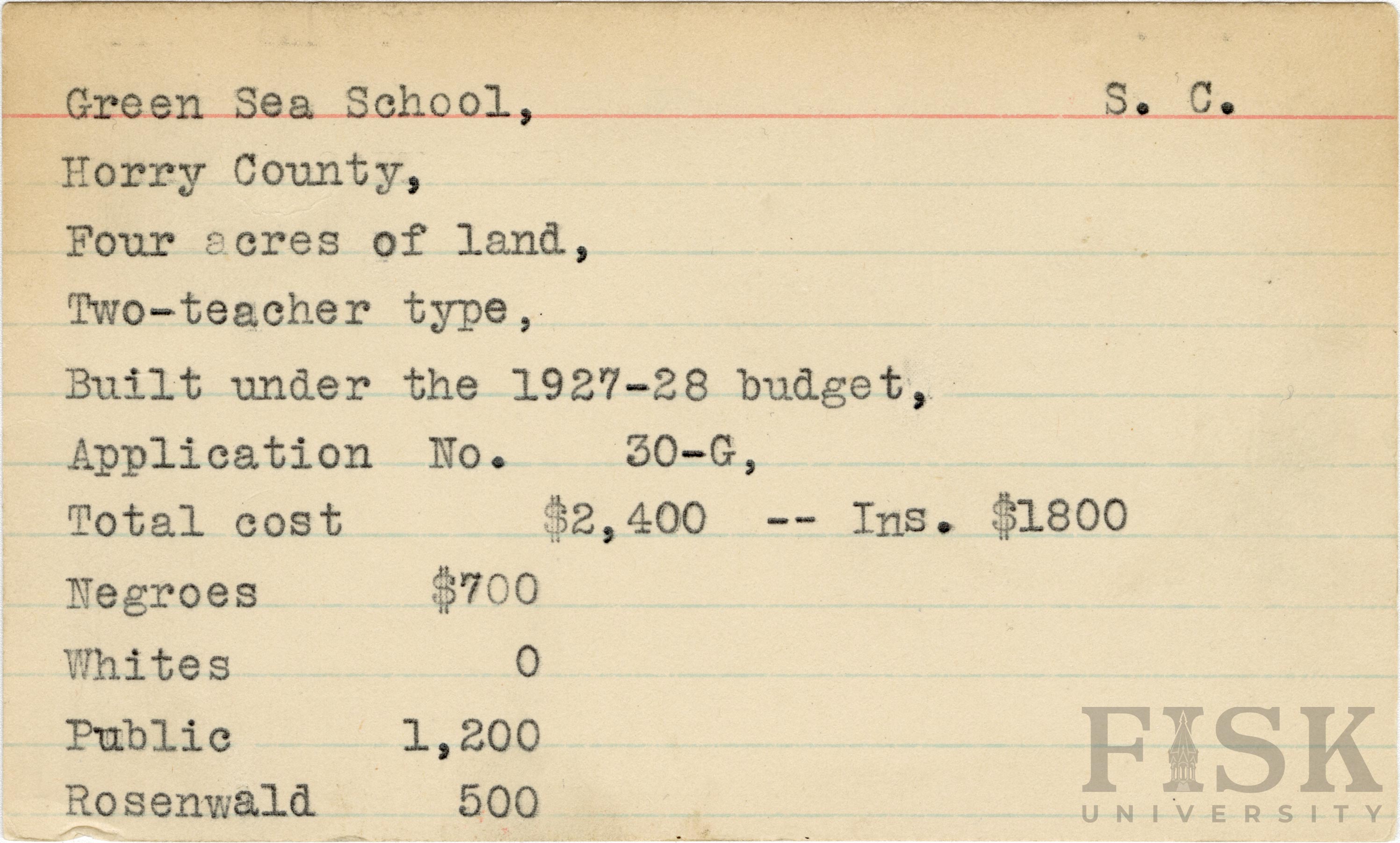 - School card from Rosenwald Fund for Green Sea School in Horry County, South Carolina with a section added to the budget contributions that says, "Ins. $1,800"