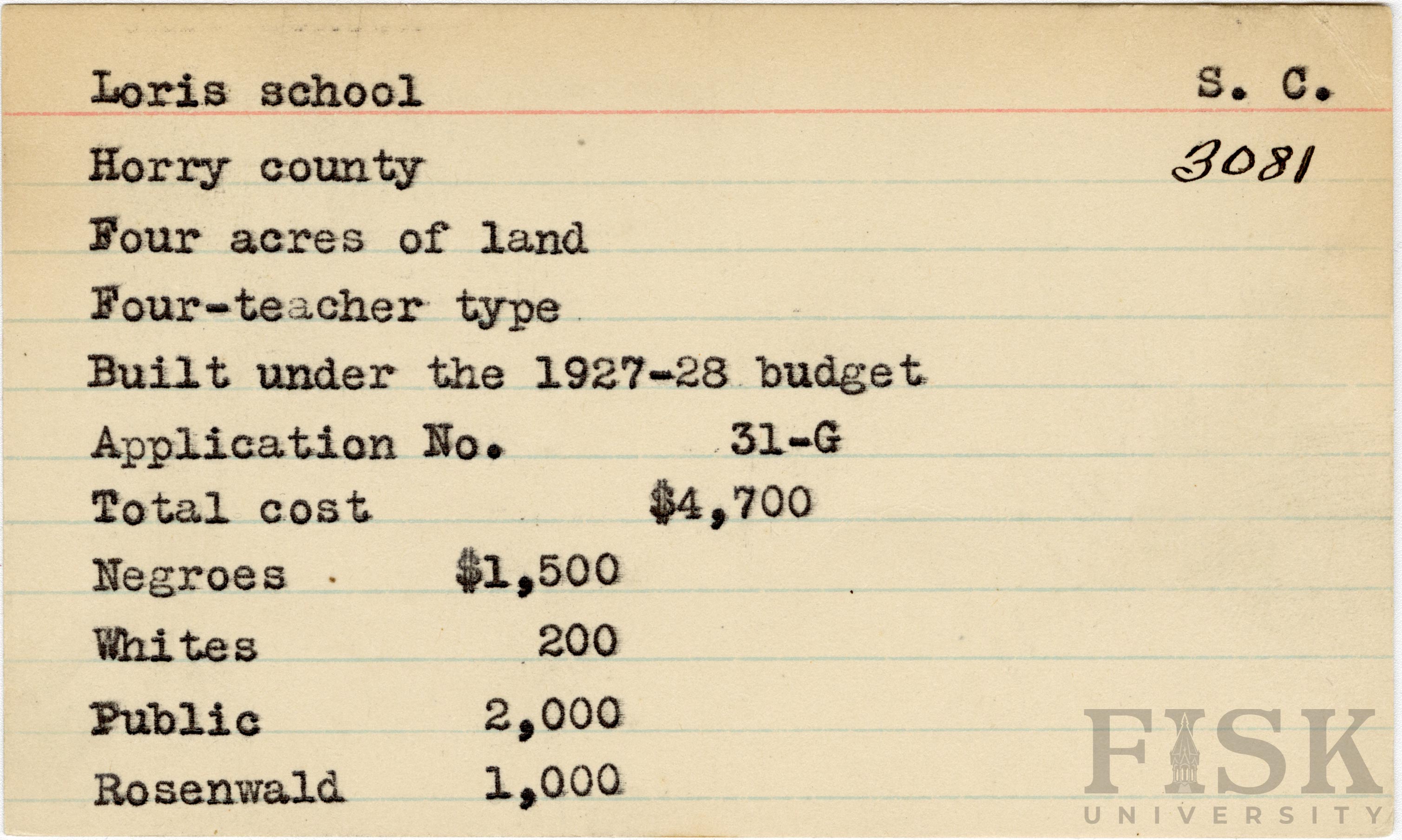 - School card from Rosenwald Fund for Loris School in Horry County, South Carolina