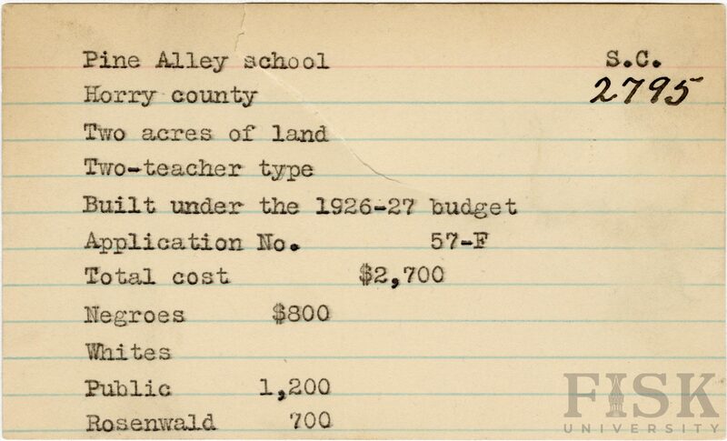 - School card from Rosenwald Fund for Pine Alley School in Horry County, South Carolina