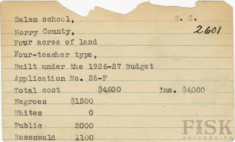 - School card from Rosenwald Fund for Salem School in Horry County, South Carolina with a section added to the budget contributions that says, "Ins. $4,000"