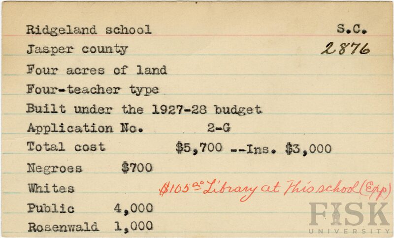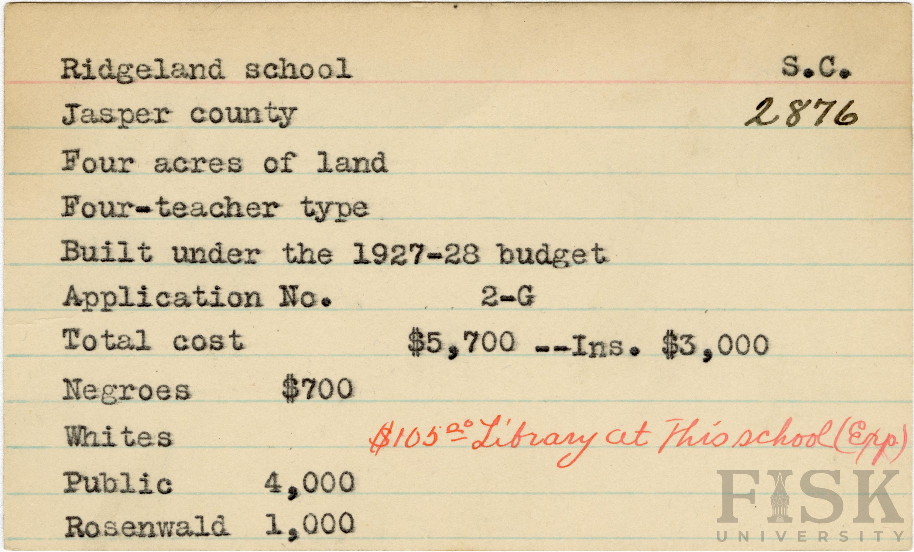 School card from Rosenwald Fund for Ridgeland School in Jasper County, South Carolina with a section added to the budget contributions that says, "Ins. $3,000" and a handwritten note on the card that says, "$105.00 library at this school (Exp)"