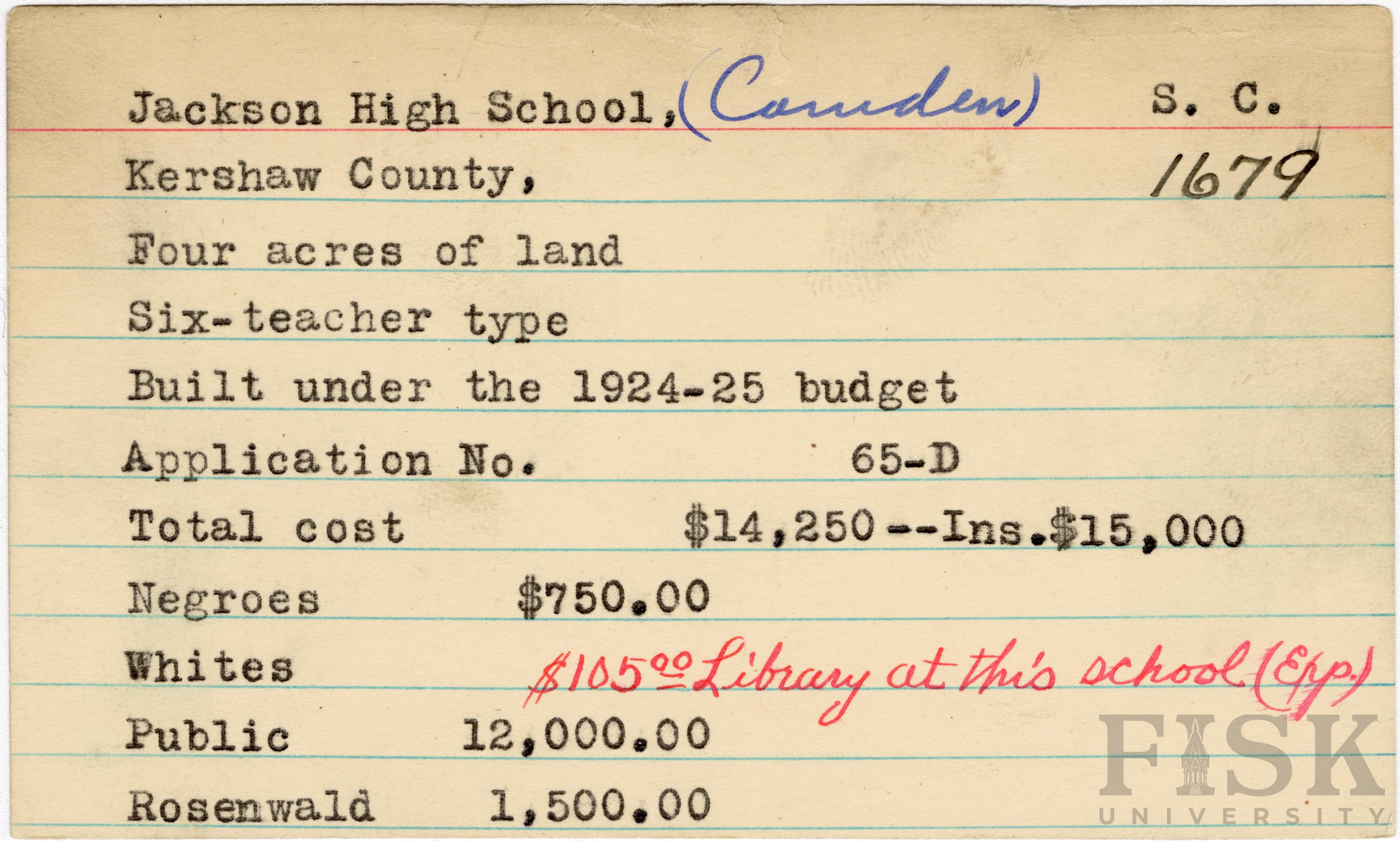 - School card from Rosenwald Fund for Jackson High School in Kershaw County, South Carolina with a section added to the budget contributions that says, "Ins. $15,000" and a handwritten note on the card that says, "$105.00 library at this school (Exp)"